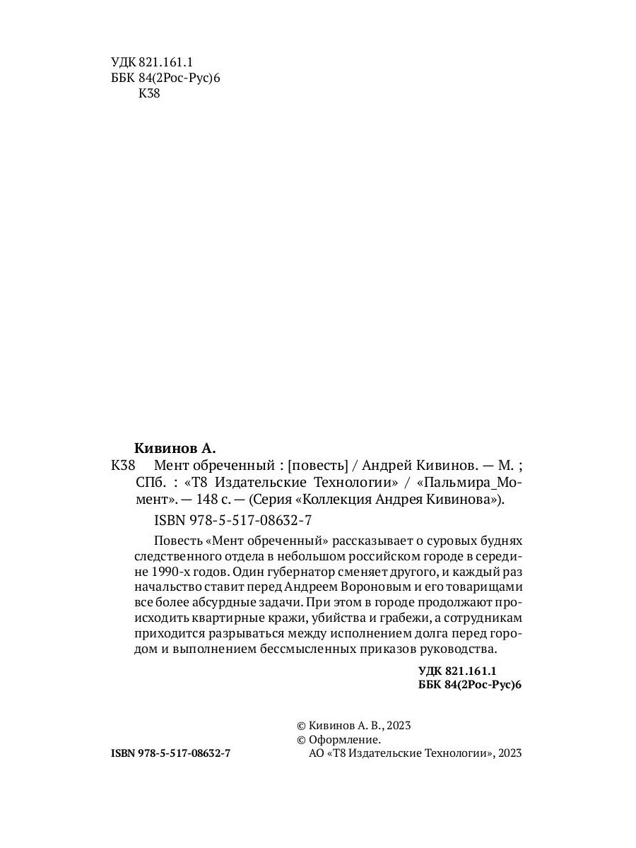 Андрей Кивинов - российский писатель, создатель героев и сюжетов, на долгие годы сформировавших образ сотрудников полиции в постсоветской России. Сериалы "Улицы разбитых фонарей" и "Убойная сила" основаны на романах Андрея Кивинова, а сам писатель в 1990-е годы занимал должность начальника отдела по раскрытию умышленных убийств в Санкт-Петербурге. Сегодня - подполковник милиции в отставке, писатель и сценарист. Повесть "Мент обреченный" рассказывает о суровых буднях следственного отдела в небольшом российском городе в середине 1990-х годов. Один губернатор сменяет другого, и каждый раз начальство ставит перед Андреем Вороновым и его товарищами все более абсурдные задачи. При этом в городе продолжают происходить квартирные кражи, убийства и грабежи, а сотрудникам приходится разрываться между исполнением долга перед городом и выполнением бессмысленных приказов руководства.| Издательство | Т8 RUGRAM |