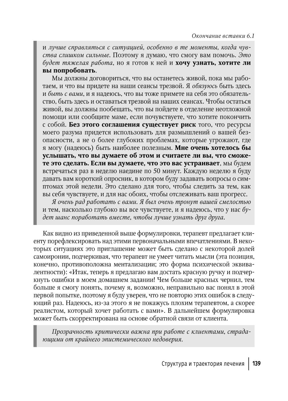 Как врачи могут помочь пациентам глубже осмыслить свои собственные мысли и эмоции, а также других людей? Как можно эффективно использовать терапевтические отношения для создания управляемых изменений? В этой книге отражен более чем 15-летний опыт работы с врачами разных школ и убеждений, желающих включить ментализирующую позицию в свою практику, в ней вы найдете ответы на интересующие вас вопросы. Издание содержит ключевые концепции, связанные с теорией и практикой: обоснование терапии, раскрытие самого понятия ментализации. Познакомит вас с развитием способности к ментализации от младенчества, детства и подросткового возраста до взрослой жизни. Научит использовать ментализацию в психологии развития, социальной нейробиологии, клинической психологии и психиатрии. Сложные идеи в книге четко объяснены и проиллюстрированы. Освещены способы помощи пациентам, борющимся с дисрегуляцией эмоций и поведения. Эта краткая книга поможет специалистам использовать новейшие стратегии в своей работе. Предназначена психотерапевтам, психиатрам и клиническим психологам.| Издательство | ГЭОТАР-Медиа |
