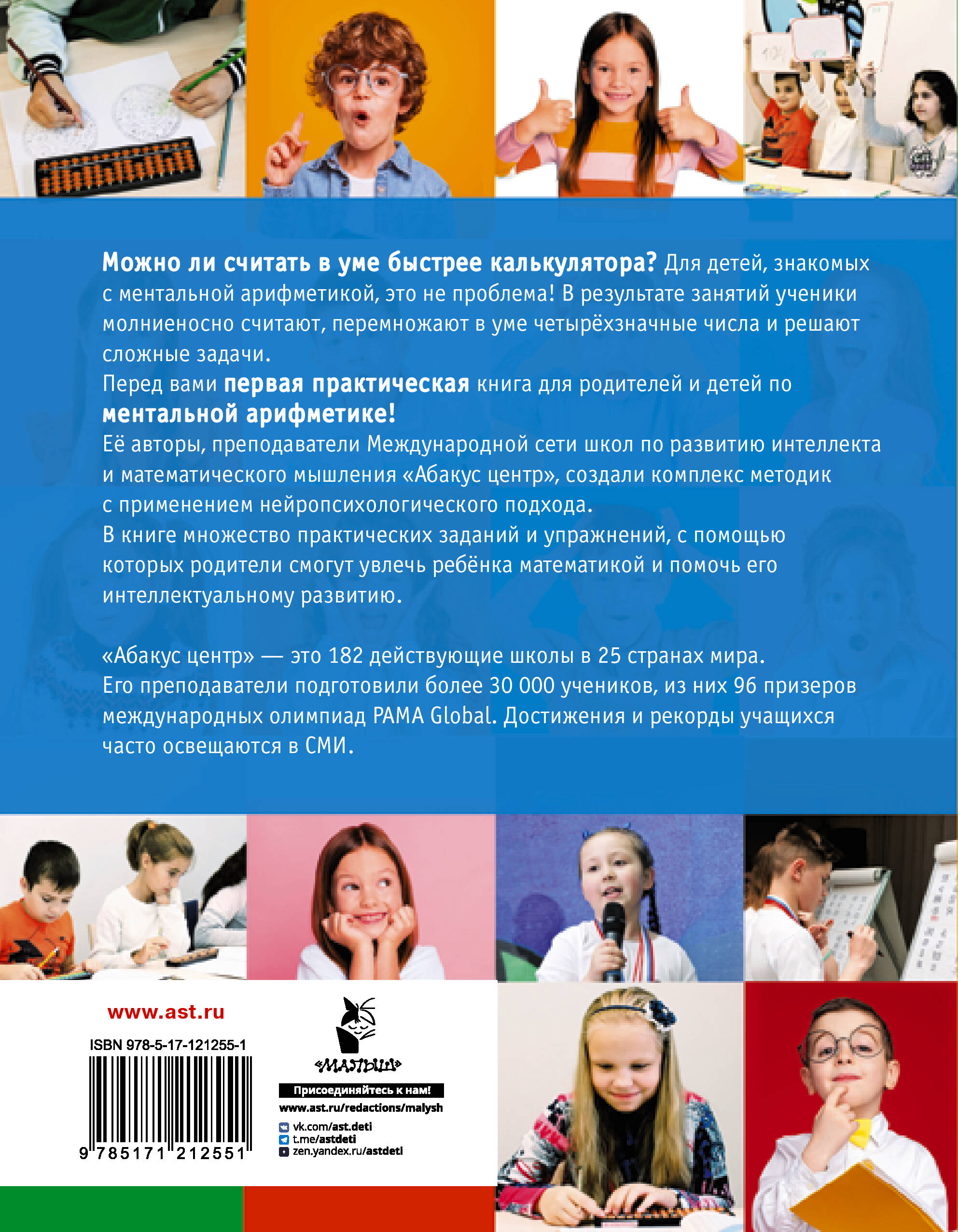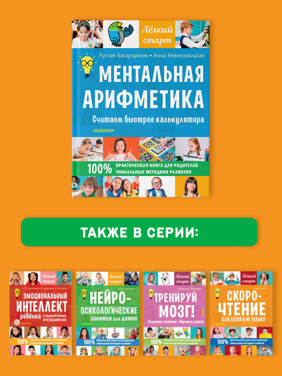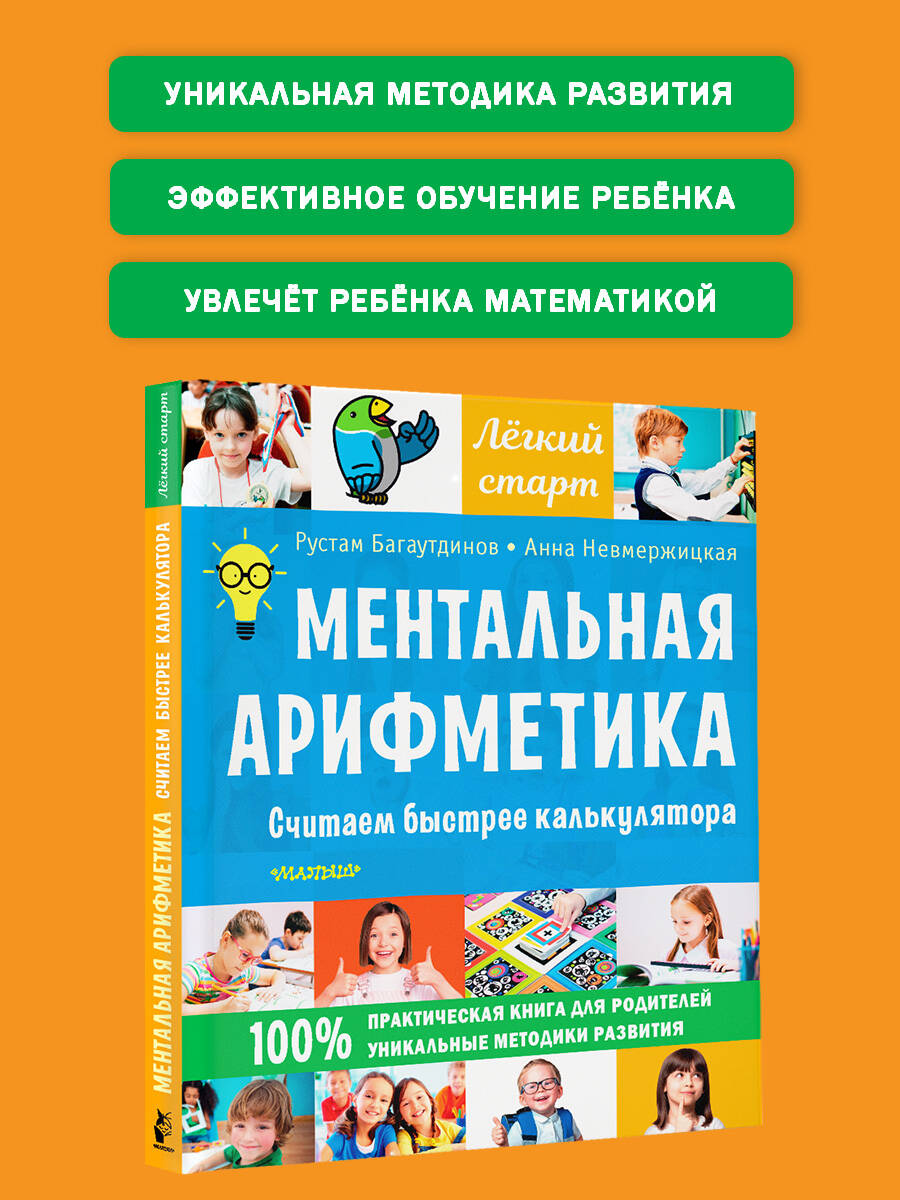«Ментальная арифметика. Считаем быстрее калькулятора». Первая практическая книга для родителей и детей по ментальной арифметике. Ментальная арифметика - это целый комплекс методик интеллектуального развития ребёнка, с применением нейропсихологического подхода. В результате таких занятий ученики молниеносно считают, перемножают в уме четырёхзначные числа и решают сложные задачи. Книга предназначена для домашних занятий с детьми от 6 лет. Она поможет освоить основы ментальной арифметики, быстрый счёт на абаке, научит разбираться в задачах, готовиться к тестам и олимпиадам в начальной школе. В книгу включено множество практических заданий и упражнений, с помощью которых родители смогут увлечь ребёнка математикой. • Ментальная арифметика очень популярна, но родителям не всегда понятно, что она из себя представляет. Наша книга понятно и подробно объясняет ценность ментальной арифметики для развития детей. • Эта книга создана преподавателями Международной сети школ «Абакус центр» по развитию интеллекта и математического мышления, работающей в 25 странах, а также онлайн по всему миру. Достижения и рекорды учеников «Абакус центра» часто освещаются в СМИ. • 31 870 учеников с 2015 г. • 457 педагогов обучено • 96 призеров олимпиад PAMA Global • 182 действующих центра в 25 странах мира| Издательство | АСТ |