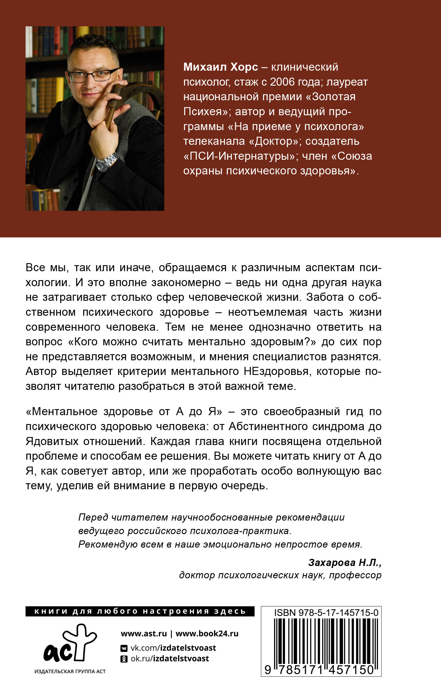 «Ментальное здоровье от А до Я» - книга, которая рекомендована к прочтению всем в наше эмоционально непростое время и содержит научно обоснованные рекомендации ведущего российского психолога-практика. Из книги вы узнаете: - какие факторы приводят к укреплению или, наоборот, к разрушению вашего ментального здоровья; - какие действия, психические состояния и мысли прежде всего воздействуют на вашу психику; - какие инструменты и техники можно использовать для укрепления своего ментального здоровья.| Издательство | АСТ |