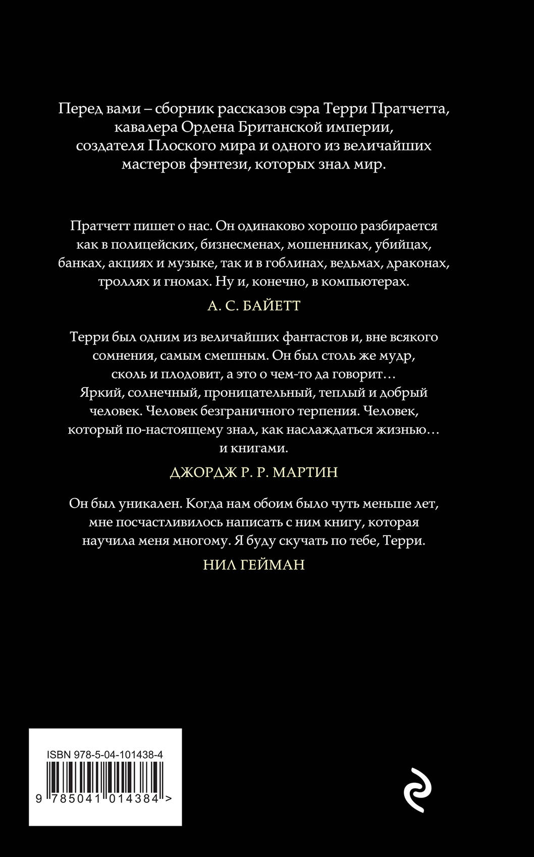 Дьявол нанимает рекламщика, чтобы популяризировать Ад. Писатель убивает опостылевшего персонажа, но следующим утром тот объявляется на пороге его дома. Незадачливые путешественники попадают в мир оживших рождественских открыток - и видят там то, что Лавкрафту не снилось. Волшебники Незримого Университета думают, как пережить проверку лорда Витинари, а капитан Моркоу решает проблему преступности среди анк-морпоркской молодежи. Встречайте сборник коротких историй сэра Терри Пратчетта: от фэнтези и стихов до научной фантастики, от первого опубликованного рассказа, написанного юным Терри в 13 лет, до отрывков, не вошедших в повести о Плоском мире.| Издательство | Эксмо |