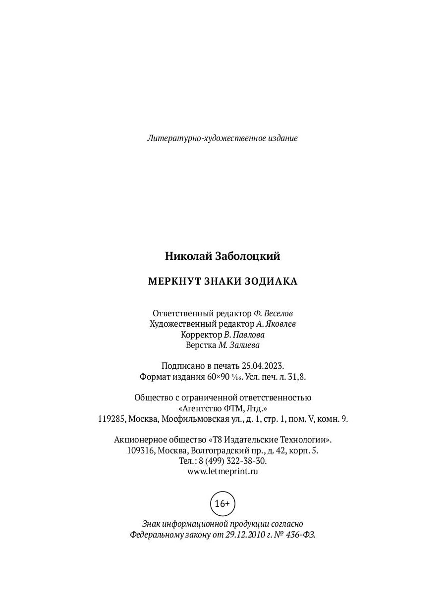 Николай Заболоцкий (1903-1958) - известный советский поэт, крупнейший переводчик грузинских поэтов, принадлежал к позднему авангарду, входил в группу ОБЭРИУ, был членом союза в писателей СССР. Репрессирован в 1938 году и позже посмертно реабилитирован. "Меркнут знаки зодиака" - сборник поэзии Заболоцкого, который позволяет наиболее полно уловить натурфилософскую концепцию автора, проходящую через все его творчество. В ее основе лежит представление о мироздании как единой системе, объединяющей живые и неживые формы материи, которые находятся в вечном взаимодействии и взаимопревращении. Философско-этические прозрения Заболоцкого выражены в классических формах, образы телесны и наполнены особой символикой. Его стихотворения напоминают части одного большого произведения, повествующего о месте человека во вселенской безграничности. В сборник также вошел перевод "Слова о полку Игореве", выполненный Николаем Заболоцким, в котором он мастерски передает очарование и поэтическое своеобразие подлинника.