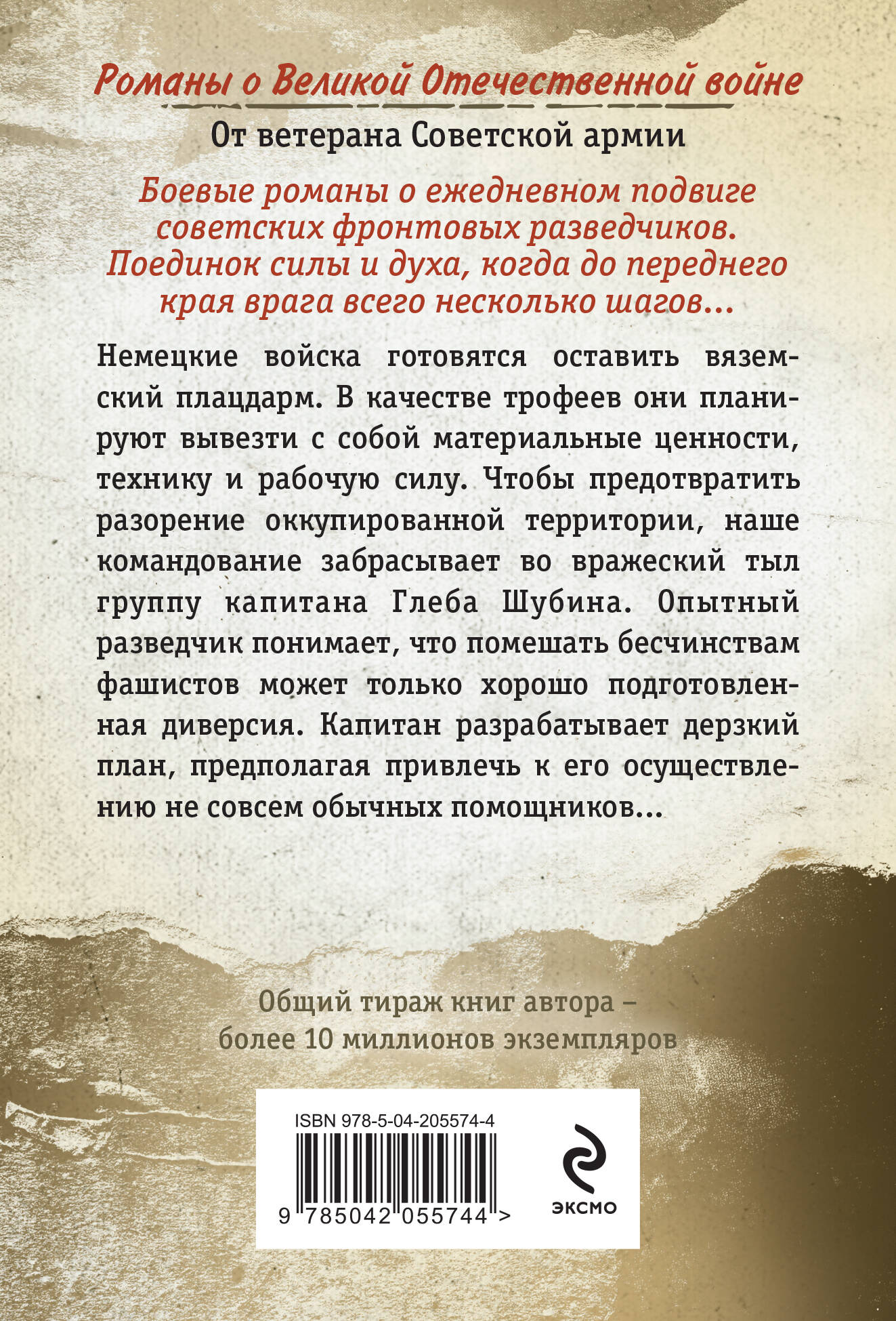 Боевые романы о ежедневном подвиге советских фронтовых разведчиков. Поединок силы и духа, когда до переднего края врага всего несколько шагов. Подробности жестоких боев, о которых не рассказывают даже ветераны - участники тех событий. Немецкие войска готовятся оставить вяземский плацдарм. В качестве трофеев они планируют вывезти с собой материальные ценности, технику и рабочую силу. Чтобы предотвратить разорение оккупированной территории, наше командование забрасывает во вражеский тыл группу капитана Глеба Шубина. Опытный разведчик понимает, что помешать бесчинствам фашистов может только хорошо подготовленная диверсия. Капитан разрабатывает дерзкий план, предполагая привлечь к его осуществлению не совсем обычных помощников… Общий тираж книг автора - более 10 миллионов экземпляров.| Издательство | ООО "Издательство "Эксмо" |