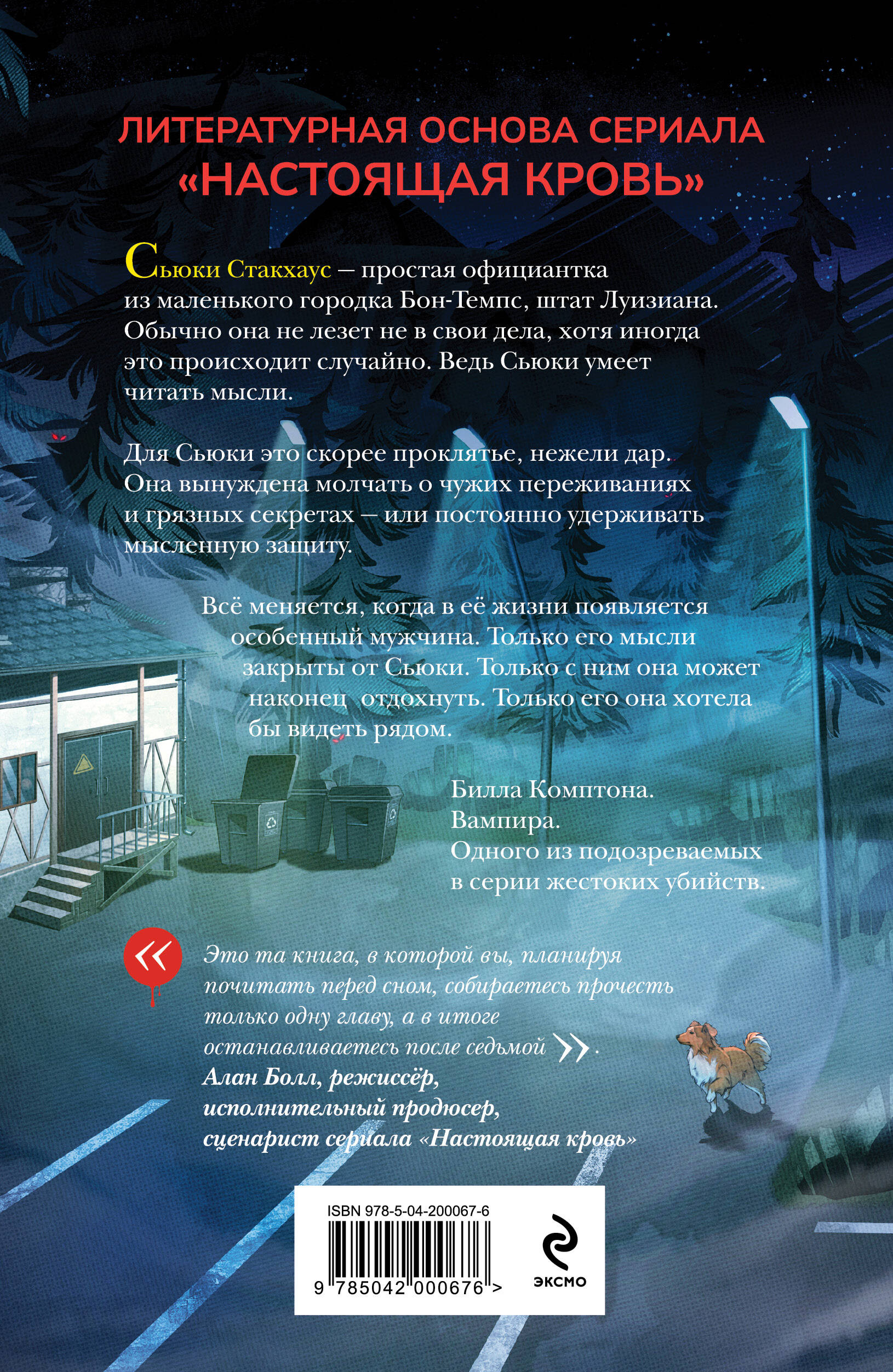 Сьюки Стакхаус - простая официантка из маленького городка Бон-Темпс, штат Луизиана. Обычно она не лезет не в свои дела, хотя иногда это происходит случайно. Ведь Сьюки умеет читать мысли. Для Сьюки это скорее проклятье, нежели дар. Она вынуждена молчать о чужих переживаниях и грязных секретах - или постоянно удерживать мысленную защиту. Всё меняется, когда в её жизни появляется особенный мужчина. Только его мысли закрыты от Сьюки. Только с ним она может, наконец, отдохнуть. Только его она хотела бы видеть рядом. Билла Комптона. Вампира. Одного из подозреваемых в серии жестоких убийств. Литературная основа сериала «Настоящая кровь», получившего премии «Золотой глобус» и «Эмми»! Первая книга самого известного цикла Шарлин Харрис в новом стильном оформлении для поклонников Энн Райс и Райчел Мид. История о сверхъестественном, в центре которой девушка с телепатическими способностями и вампир. Таинственные события, опасные враги и горячие сцены - прекрасный пейджтёрнер. Формат большого покета, который удобно брать с собой.| Издательство | ООО "Издательство "Эксмо" |