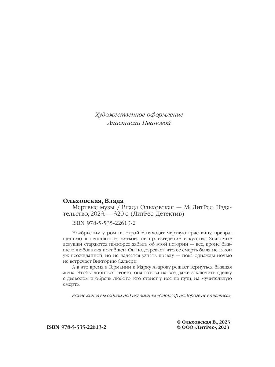 Ноябрьским утром на стройке находят мертвую красавицу, превращенную в непонятное, жутковатое произведение искусства. Знакомые девушки стараются поскорее забыть об этой истории - все, кроме бывшего любовника погибшей. Он подозревает, что ее смерть была не такой уж неожиданной, но не надеется узнать правду - пока однажды ночью не встречает Викторию Сальери. А в это время в Германии к Марку Азарову решает вернуться бывшая жена. Чтобы добиться своего, она готова на все, даже заключить сделку с дьяволом и обречь любого, кто станет у нее на пути, на мучительную смерть. Ранее книга выходила под названием "Спонсор на дороге не валяется".| Издательство | Т8 RUGRAM |