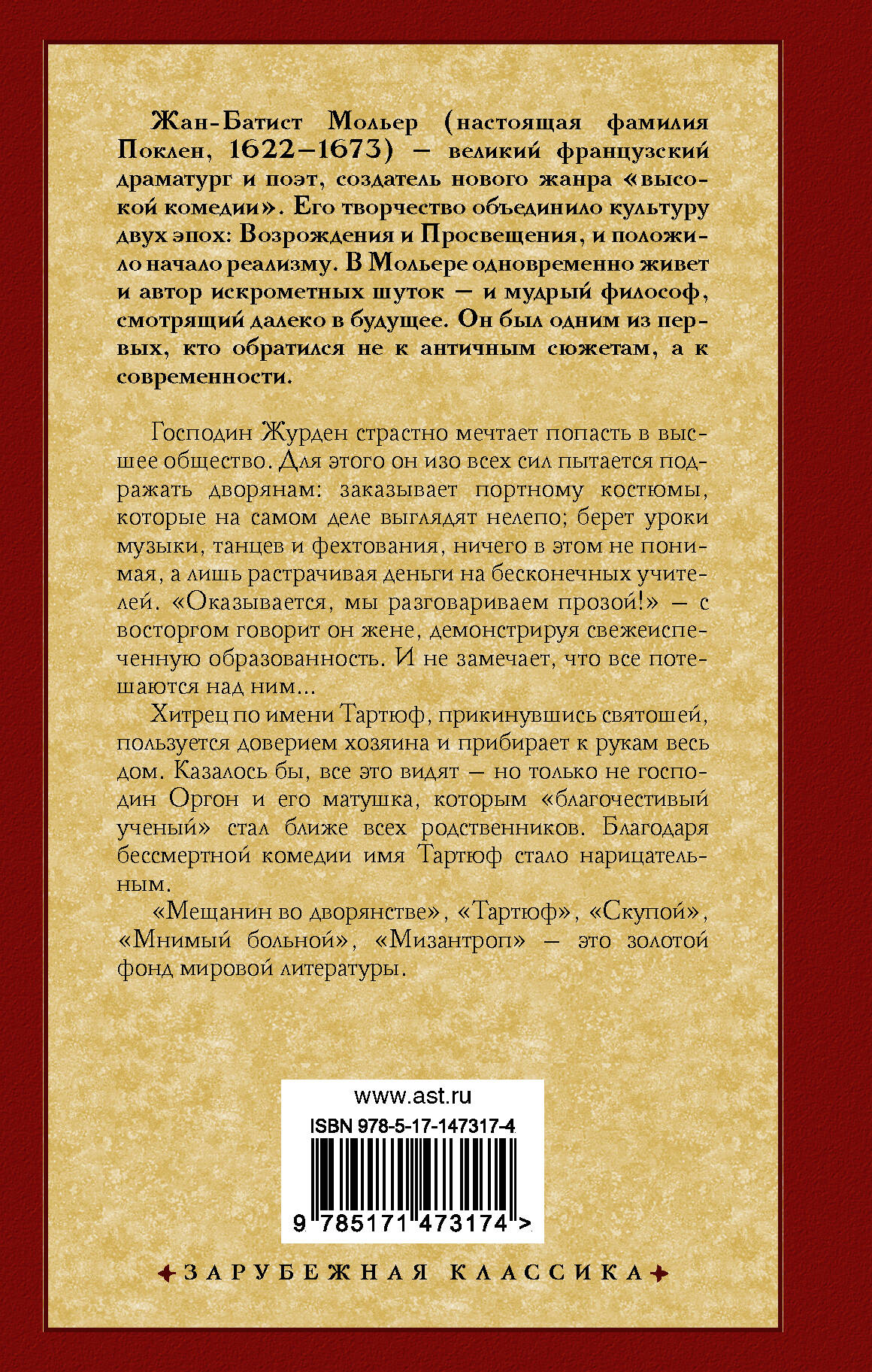 Господин Журден страстно мечтает попасть в высшее общество. Для этого он изо всех сил пытается подражать дворянам: заказывает портному костюмы, которые на самом деле выглядят нелепо; берет уроки музыки, танцев и фехтования, ничего в этом не понимая, а лишь растрачивая деньги на бесконечных учителей. "Оказывается, мы разговариваем прозой!" - с восторгом говорит он жене, демонстрируя свежеиспеченную образованность. И не замечает, что все потешаются над ним… Хитрец по имени Тартюф, прикинувшись святошей, пользуется доверием хозяина и прибирает к рукам весь дом. Казалось бы, все это видят - но только не господин Оргон и его матушка, которым "благочестивый ученый" стал ближе всех родственников. Благодаря бессмертной комедии имя Тартюф стало нарицательным. "Мещанин во дворянстве", "Тартюф", "Скупой", "Мнимый больной", "Мизантроп" - это золотой фонд мировой литературы.| Издательство | АСТ |