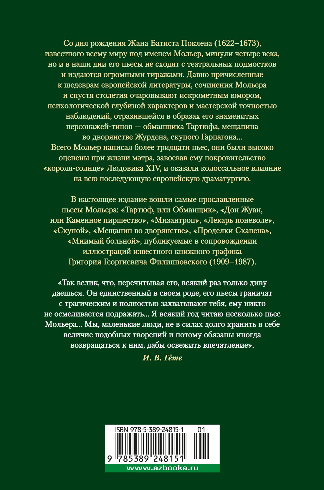Со дня рождения Жана Батиста Поклена (1622-1673), известного всему миру под именем Мольер, минули четыре века, но и в наши дни его пьесы не сходят с театральных подмостков и издаются огромными тиражами. Давно причисленные к шедеврам европейской литературы, сочинения Мольера и спустя столетия очаровывают искрометным юмором, психологической глубиной характеров и мастерской точностью наблюдений, отразившейся в образах его знаменитых персонажей-типов - обманщика Тартюфа, мещанина во дворянстве Журдена, скупого Гарпагона... Всего Мольер написал более тридцати пьес, они были высоко оценены при жизни мэтра, завоевав ему покровительство «короля-солнце» Людовика XIV, и оказали колоссальное влияние на всю последующую европейскую драматургию. В настоящее издание вошли самые прославленные пьесы Мольера: «Тартюф, или Обманщик», «Дон Жуан, или Каменное пиршество», «Мизантроп», «Лекарь поневоле», «Скупой», «Мещанин во дворянстве», «Проделки Скапена», «Мнимый больной», публикуемые в сопровождении иллюстраций известного книжного графика Григория Георгиевича Филипповского (1909-1987). «Так велик, что, перечитывая его, всякий раз только диву даешься. Он единственный в своем роде, его пьесы граничат с трагическим и полностью захватывают тебя, ему никто не осмеливается подражать… Я всякий год читаю несколько пьес Мольера… Мы, маленькие люди, не в силах долго хранить в себе величие подобных творений и потому обязаны иногда возвращаться к ним, дабы освежить впечатление» (И. В. Гёте).| Издательство | Иностранка |