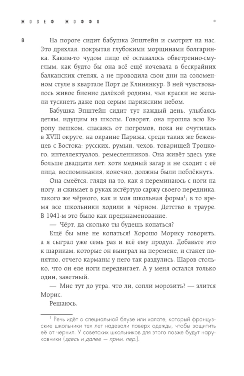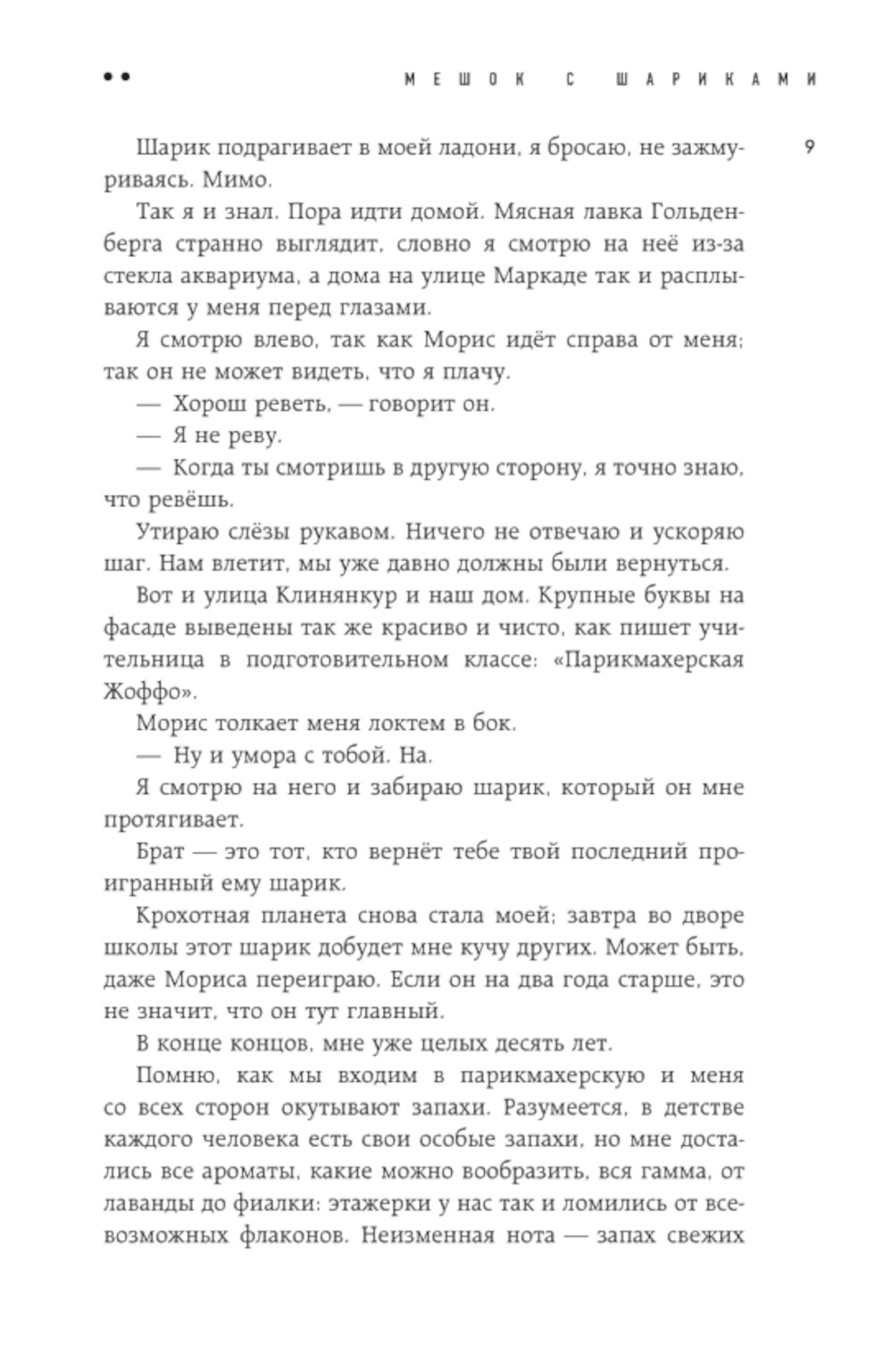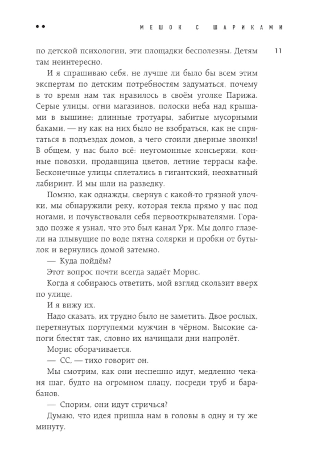 В 1941 году в Париже двое братьев беззаботно играют в свою любимую игру в шарики. Уже этим вечером окажется, что десятилетнему Жозефу и двенадцатилетнему Морису придётся самостоятельно бежать через всю страну к своим старшим братьям в свободную от немецкой оккупации зону. Автобиографический роман стал классикой французской литературы, был переведён на 18 языков и лёг в основу фильма «Мешок мрамора». В книге - душераздирающая и одновременно вдохновляющая история о том, с чем пришлось столкнуться маленькому еврею в захваченной нацистами стране. В этом тяжёлом путешествии братья столкнутся с человеческой жестокостью, с ужасами Холокоста и Второй мировой войны. Однако даже в такой ситуации дети остаются детьми и находят светлые моменты и неожиданную поддержку.| Издательство | Эксмо |