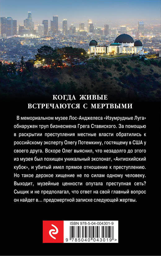 В мемориальном музее Лос-Анджелеса "Изумрудные Луга" обнаружен труп бизнесмена Грега Ставиского. За помощью в раскрытии преступления местные власти обратились к российскому эксперту Олегу Потемкину, гостящему в США у своего друга. Вскоре Олег выяснил, что незадолго до этого из музея был похищен уникальный экспонат, "Антиохийский кубок", и убитый имел прямое отношение к преступлению. Но такое дерзкое хищение не по силам одному человеку. Выходит, музейные ценности опутала преступная сеть? Сыщик и не предполагал, что ответ на свой главный вопрос он найдет в… предсмертной записке следующей жертвы.| Издательство | ООО "Издательство "Эксмо" |