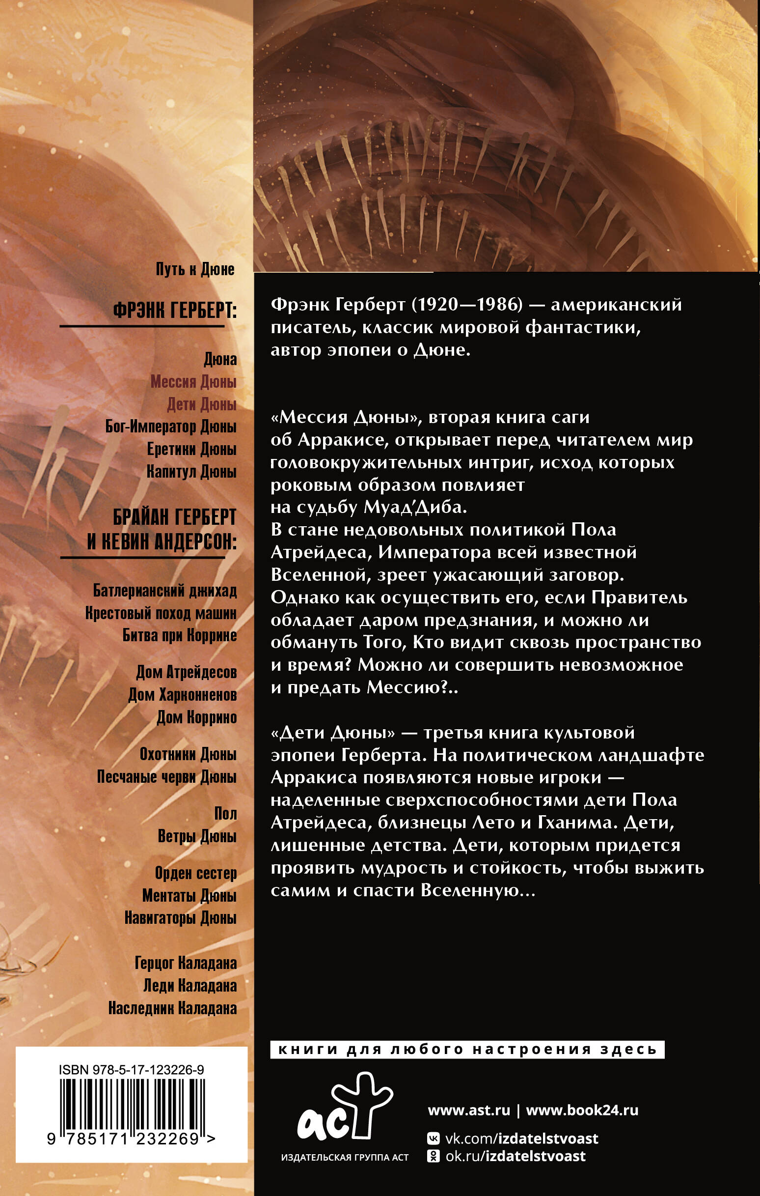 "Мессия Дюны", вторая книга саги об Арракисе, открывает перед читателем мир головокружительных интриг, исход которых роковым образом повлияет на судьбу Муад'Диба. В стане недовольных политикой Пола Атрейдеса, Императора всей известной Вселенной, зреет ужасающий заговор. Однако как осуществить его, если Правитель обладает даром предзнания, и можно ли обмануть Того, Кто видит сквозь пространство и время? Можно ли совершить невозможное и предать Мессию?.. "Дети Дюны" - третья книга культовой эпопеи Герберта. На политическом ландшафте Арракиса появляются новые игроки - наделенные сверхспособностями дети Пола Атрейдеса, близнецы Лето и Гханима. Дети, лишенные детства. Дети, которым придется проявить мудрость и стойкость, чтобы выжить самим и спасти Вселенную…| Издательство | ИЗДАТЕЛЬСТВО "АСТ" |