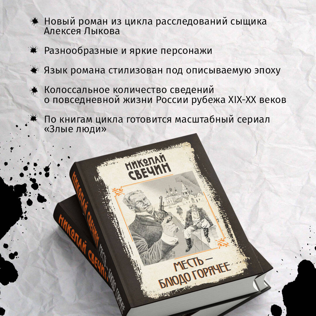 В начале 1914 года в Департаменте полиции готовится смена руководства. Директор предлагает начальнику уголовного сыска Алексею Николаевичу Лыкову съездить с ревизией куда-нибудь в глубинку, чтобы пересидеть смену власти. Лыков выбирает Рязань. Его приятель генерал Таубе просит Алексея Николаевича передать денежный подарок своему бывшему денщику Василию Полудкину, осевшему в Рязани. Пятьдесят рублей для отставного денщика, пристроившегося сторожем на заводе, большие деньги. Но подарок приносит беду - сторожа убивают и грабят. Формальная командировка обретает новый смысл. Лыков считает долгом покарать убийц бывшего денщика своего друга. Он выходит на след некоего Егора Князева по кличке Князь - человека, отличающегося амбициями и жестокостью. Однако задержать его в Рязани не удаётся… Захватывающий исторический детектив от победителя премии «Русский детектив» Николая Свечина. Роман входит в цикл произведений о сыщике Алексее Лыкове и является 36-м по счёту. «В новом романе "Месть - блюдо горячее" автор мастерски воссоздаёт атмосферу Российской империи начала XX века, умело сплетая детективную интригу с историческими фактами. Главный герой романа, Алексей Лыков, - сильный и харизматичный персонаж, которому хочется сопереживать. Его борьба за справедливость и стремление докопаться до истины вызывают уважение. Вместе с ним читатель погружается в мир тайн и интриг, где каждый персонаж может оказаться либо союзником, либо врагом. Отдельно хочу отметить язык повествования - лёгкий и доступный, но при этом богатый и выразительный. Это делает чтение ещё более приятным. Я уверена, что книга "Месть - блюдо горячее" понравится всем любителям исторических детективов. Рекомендую её к прочтению!» - Татьяна Степанова, автор мистических триллеров и детективов| Издательство | ООО "Издательство "Эксмо" |