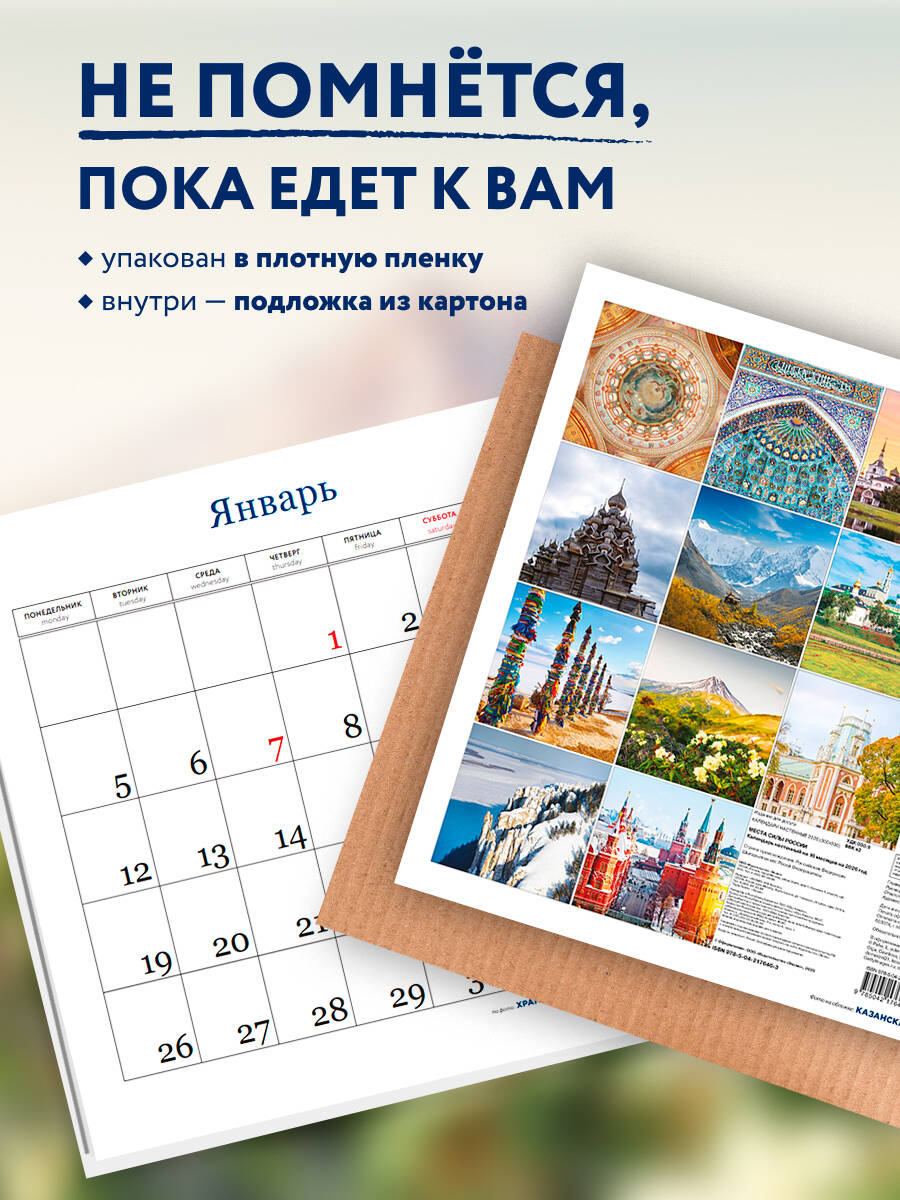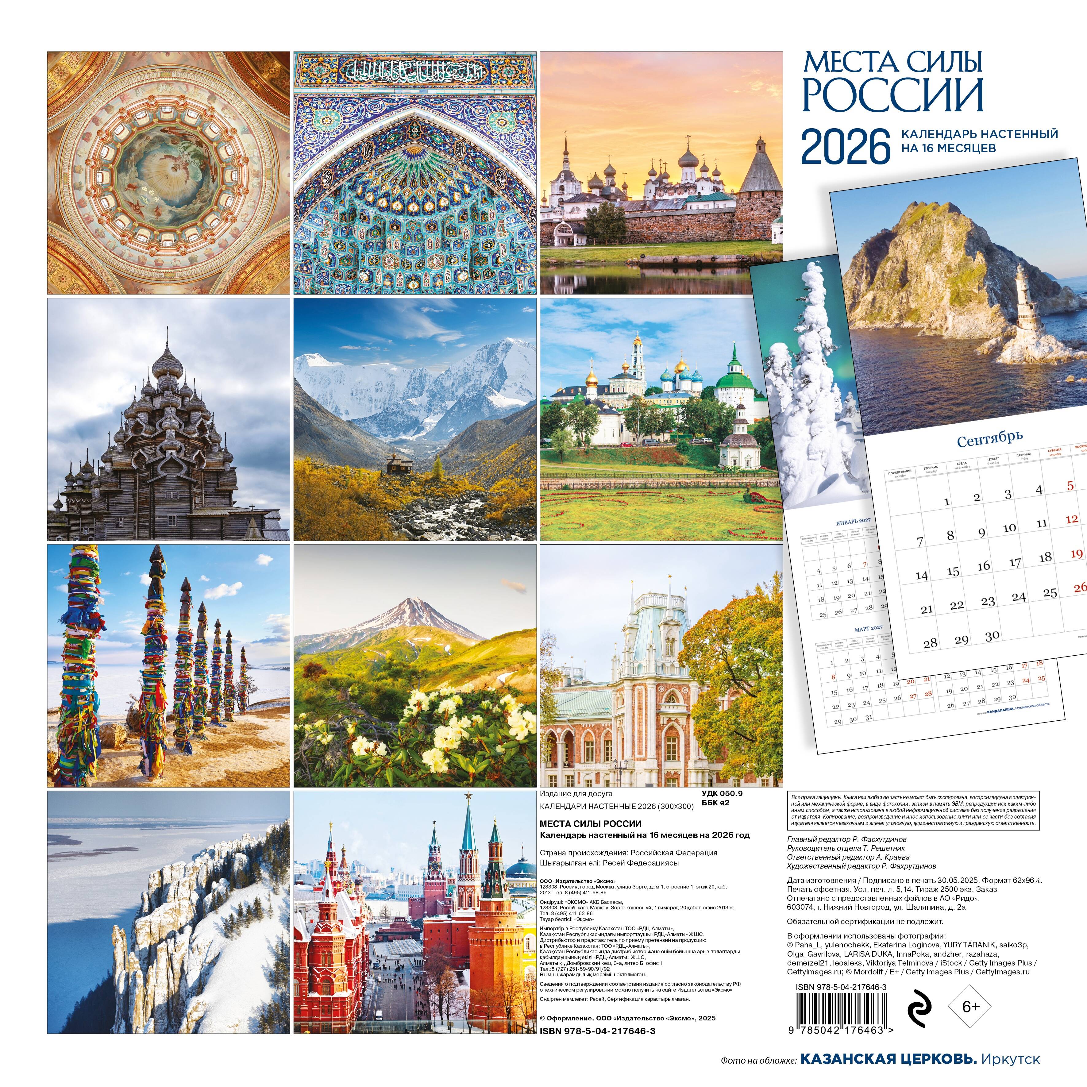 О серии: Наши настенные календари отличаются высоким качеством исполнения! Тщательно подобранные иллюстрации, напечатанные на глянцевой бумаге высочайшего качества, станут настоящим украшением дома, а в календарной сетке найдется место для ваших планов: большие клетки позволят делать записи и организовать свой год! В календаре также отмечены все государственные праздники. В серии настенных календарей издательства «ЭКСМО» каждый найдет тему по вкусу: великие художники, великолепные подборки с самыми знаменитыми произведениями искусства, легендарные кинематографические саги и игры, главные книжные авторы и бестселлеры, фотографии и иллюстрации любимых животных и многое-многое другое! О календаре: В этом календаре собраны атмосферные и яркие снимки мест силы России - от величественных храмов и монастырей до природных святынь и знаковых достопримечательностей. Здесь - Байкал и Соловки, Камчатка и Москва, Якутия и Петербург. Каждый невероятный кадр наполнен энергией, которая вдохновляет и наполняет изнутри. Также в календарь включен дополнительный разворот с первыми четырьмя месяцами 2026 года! Для кого: Этот календарь отлично подойдет для тех, кто хочет насладиться красотами нашей страны. Технические параметры: - Тип календаря - настенный перекидной. - Год - 2026. - Календарная сетка - с разбивкой по месяцам. - Вид скрепления - скрепка. - Ширина - 30 см. - Высота - 30 см. - Внутренний блок - мелованная бумага 115 г/м2. - Подложка - плотный гофрокартон для поддержания формы. - Индивидуальная упаковка в плотный целлофановый пакет.| Издательство | ООО "Издательство "Эксмо" |