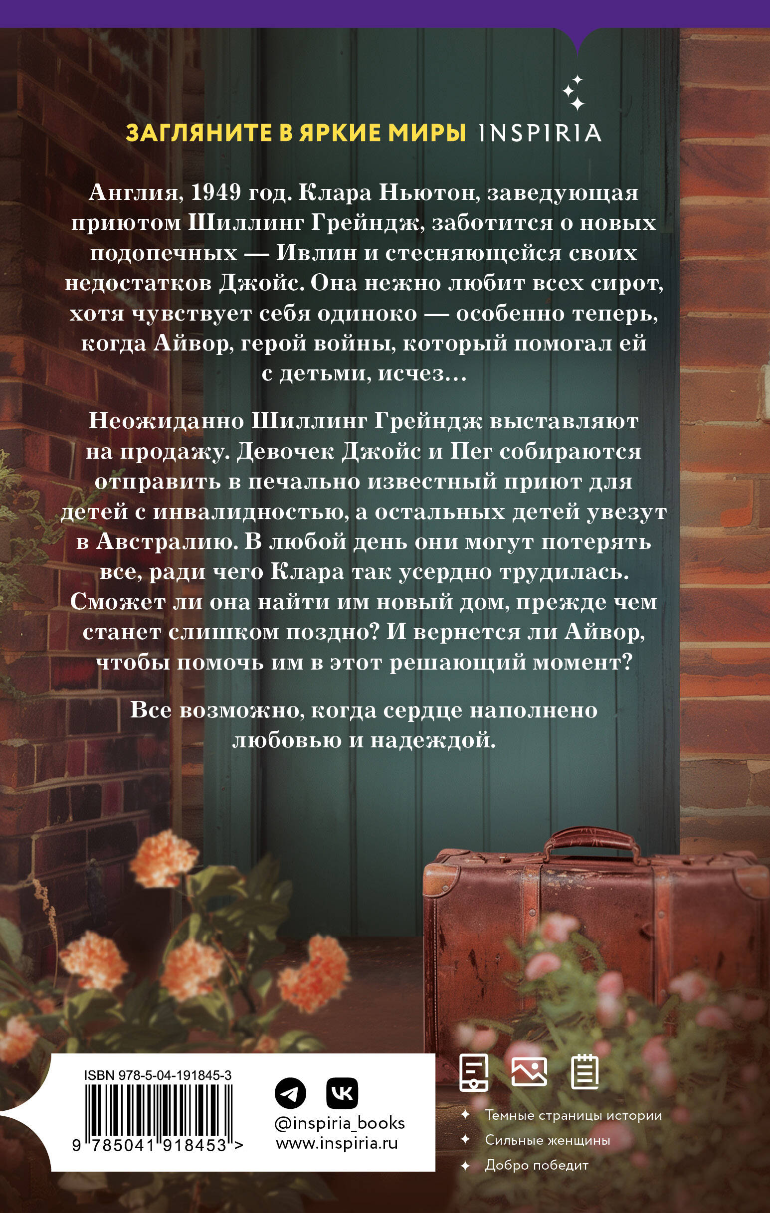 Вторая часть серии книг Лиззи Пейдж! Англия, 1949 год. Клара Ньютон, заведующая приютом Шиллинг Грейндж, заботится о новых подопечных - Ивлин и стесняющейся своих недостатков Джойс. Она нежно любит всех сирот, хотя чувствует себя одиноко - особенно теперь, когда Айвор, герой войны, который помогал ей с детьми, исчез… Неожиданно Шиллинг Грейндж выставляют на продажу. Девочек Джойс и Пег собираются отправить в печально известный приют для детей с инвалидностью, а остальных детей увезут в Австралию. В любой день они могут потерять все, ради чего Клара так усердно трудилась. Сможет ли она найти им новый дом, прежде чем станет слишком поздно? И вернется ли Айвор, чтобы помочь им в этот решающий момент? Все возможно, когда сердце наполнено любовью и надеждой. Для поклонников книг и фильмов «Пианист», «Список Шиндлера», «Жизнь прекрасна», «Клуб любителей книг и пирогов из картофельных очистков», «Девушка из Германии» и «Таинственный сад».| Издательство | ООО "Издательство "Эксмо" |