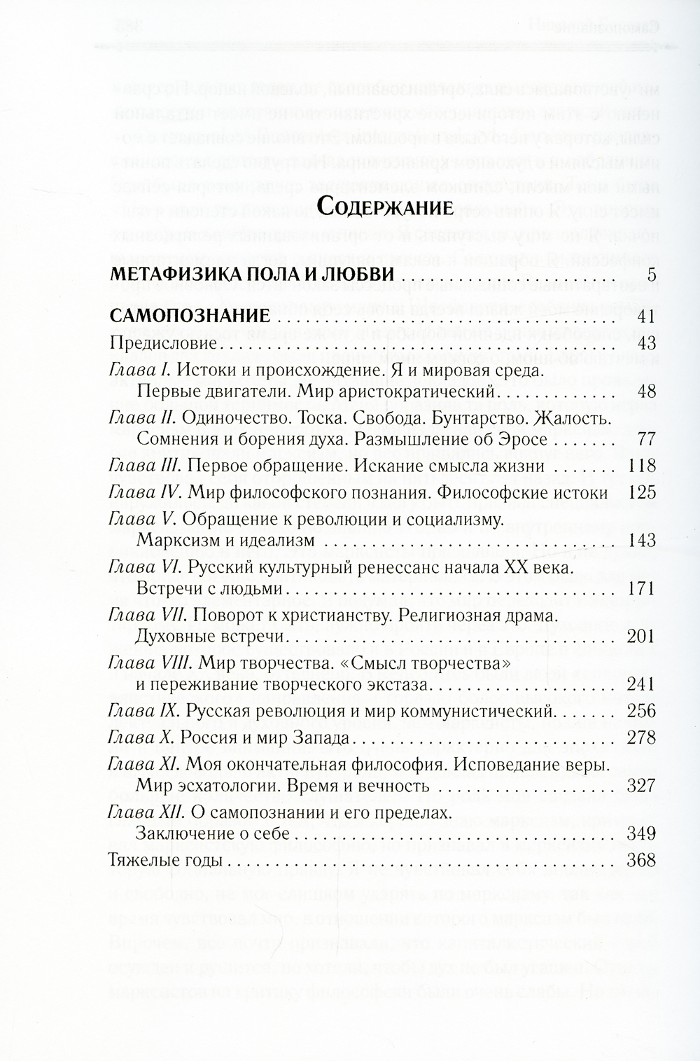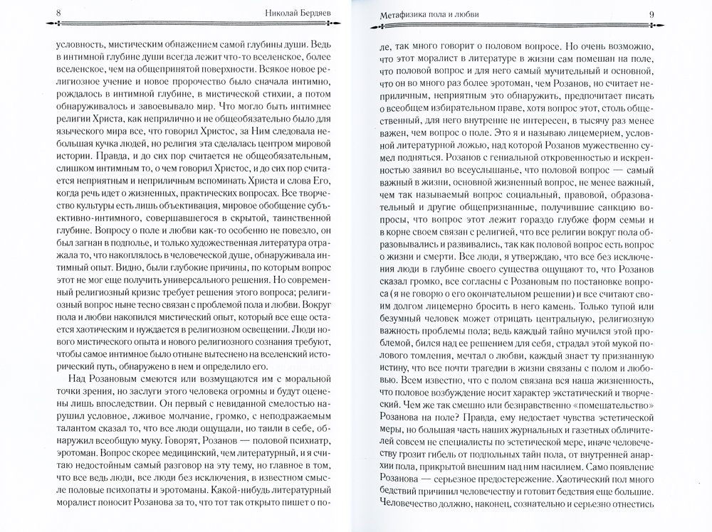 В этот сборник вошли два наиболее известных произведения Н. А. Бердяева. "Метафизика пола и любви" - небольшая, но очень важная работа философа, в которой он описывает два крайних подхода к проблеме пола: вульгарную чувственность и консервативное стремление к обузданию пола. Также Н. А. Бердяев описывает два типа любви: половое индивидуальное избрание - слияние начала мужественного с вечной женственностью, и христианскую любовь. "Самопознание" - это уникальная философская автобиография, в которой автор повествует об истории России и Запада первой половины XX века, о становлении своих философских взглядов, о своих современниках, а главное - о своей жизни.