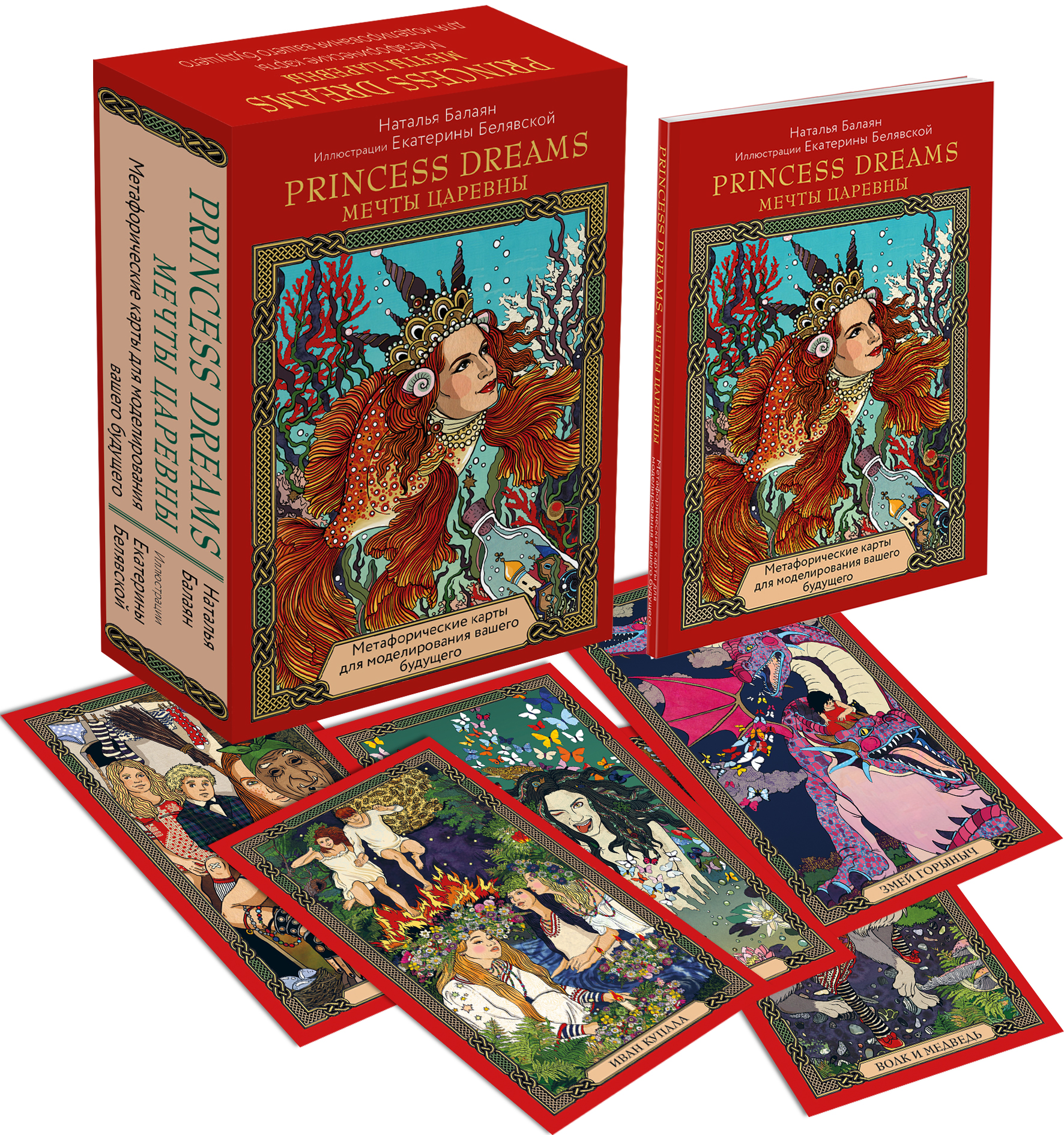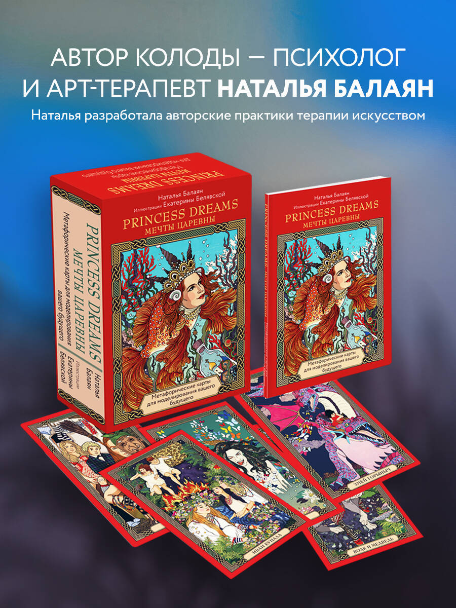 Метафорические карты «PRINCESS DREAMS. МЕЧТЫ ЦАРЕВНЫ» составлены психологом Натальей Балаян на основе метода работы с подсознанием и ассоциациями, описанным Ассаджиоли. Это не оракул, это практичный проверенный инструмент, который помогает разобраться со своими внутренними состояниями и правильно оценивать потенциал будущего. Великолепные иллюстрации известного современного художника Екатерины Белявской делают эту колоду не просто полезным инструментом, но и дарят эстетическое удовольствие от нового прочтения образов всеми любимых русских сказок. Внутри вы найдете 33 карты и брошюру с описанием методики работы с колодой и трактовки каждой карты. Приятного путешествия к своим мечтам и подсознанию! Пусть эта колода откроет для вас новые горизонты ваших возможностей, ключи к пониманию себя и моделированию вашего будущего.| Издательство | ООО "Издательство "Эксмо" |