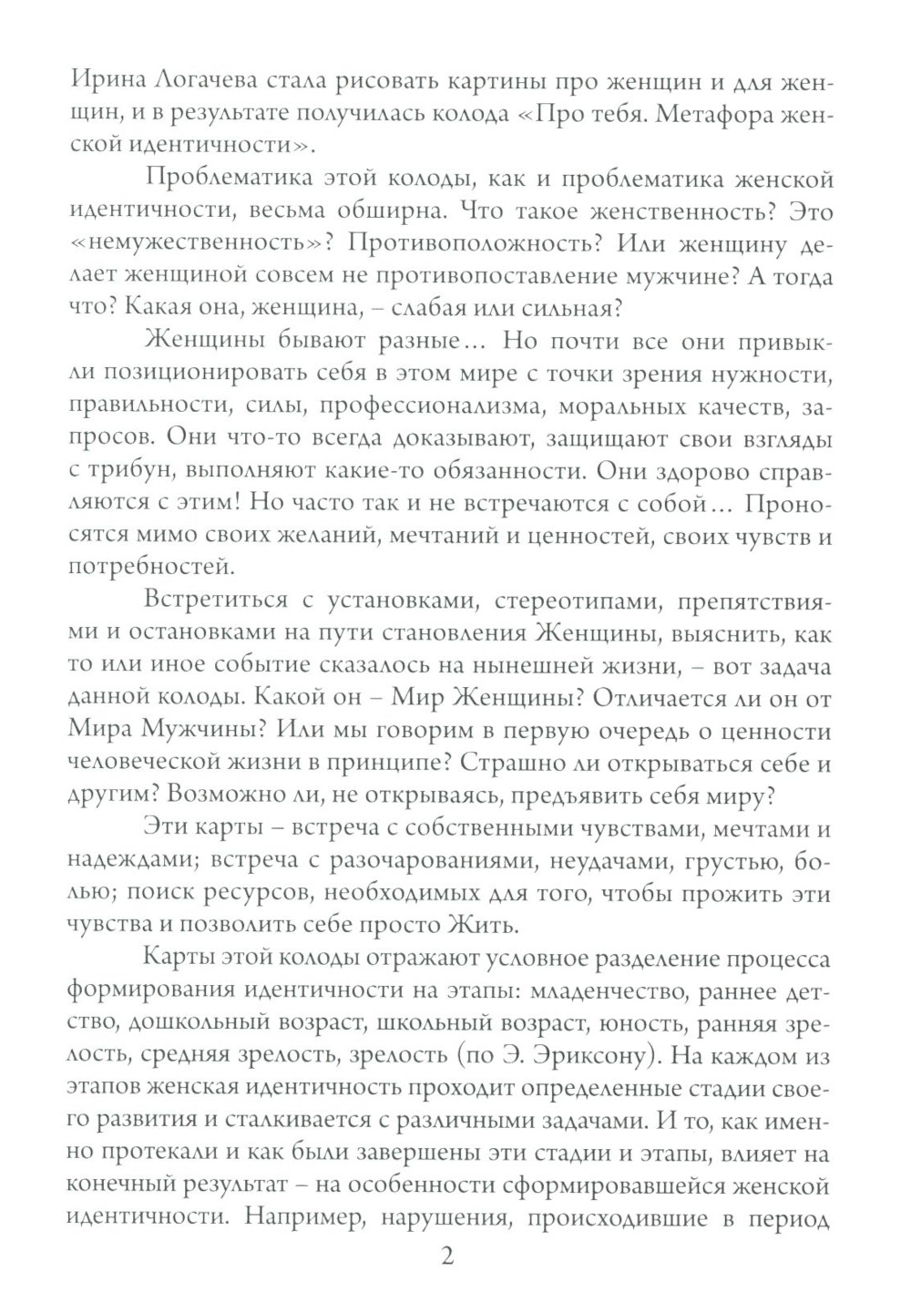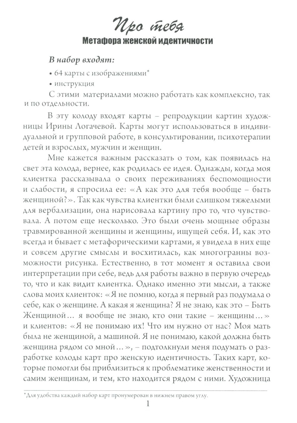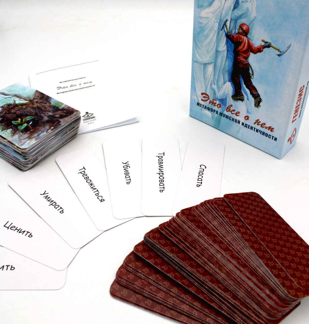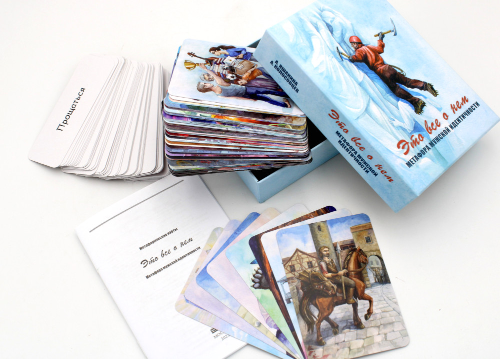 Комплект метафорических карт поможет познать себя и проработать проблемы. Составленные психологами, входящие в комплект наборы "Про тебя" и "Все о нем", помогут раскрыться как женщинам, так и мужчинам. Набор карт "Про тебя" - это 64 карты с авторскими рисунками художницы Ирины Логачевой и написанная психологом Галиной Батищевой инструкция для психологов. Проблематика этой колоды, как и проблематика женской идентичности, весьма обширна. Какая она, женщина - слабая или сильная? Что делает женщину женщиной - противопоставление мужчине или что-то другое - совершенно особенное, своеобразное? А может, специфически женской и мужской проблематики вообще не существует, а есть общечеловеческая? Каким представлениям о женской сути женщина должна соответствовать, а какие можно считать предрассудками? Обо всем это можно поговорить и подумать, работая с метафорическими картами «Про тебя. Метафора женской идентичности». Психологическая работа с женской проблематикой - это всегда встреча с сильными чувствами: с мечтами, надеждами, разочарованиями, неудачами, грустью, болью; по всегда исцеление травм и поиск ресурсов, необходимых для того чтобы позволить себе просто Жить. Колода "Про тебя" позволяет работать и с более общими проблемами: последствиями пережитого насилия, тревожностью, с зависимостями и созависимостью, с трудностями сепарации и половой идентификации... Все зависит от потребностей клиента и ваших возможностей. Колода "Это все о нем" позволяет работать с целым кругом проблем: детско-родительские отношения; вопросы гендерной идентичности; отношения между полами (в том числе сексуальные); проживание возрастных и экзистенциальных кризисов; различные виды зависимостей; темы агрессии, власти, денег, а также карьеры, успешности и самореализации.Использование метафорических карт помогает мужчинам начать разговор на неоднозначные, табуированные в обществе и часто запретные для них самих темы, позволяет затрагивать глубинные личностные проблемы, но главное, дает возможность проработать интеграцию мужского и женского начал личности.В набор входят: 64 карты с авторскими рисунками художницы Ирины Логачёвой, созданными на основе идей психологов Алёны Яшаниной и Андрея Колосовцева; 64 карточки с глаголами; инструкция.| Издательство | Генезис |