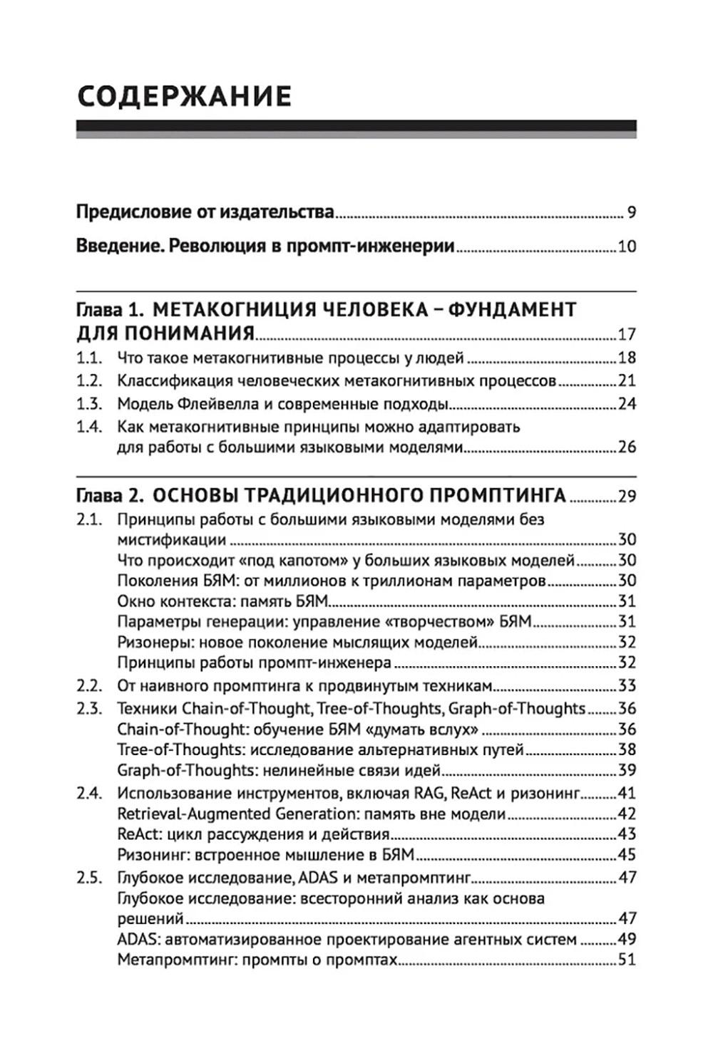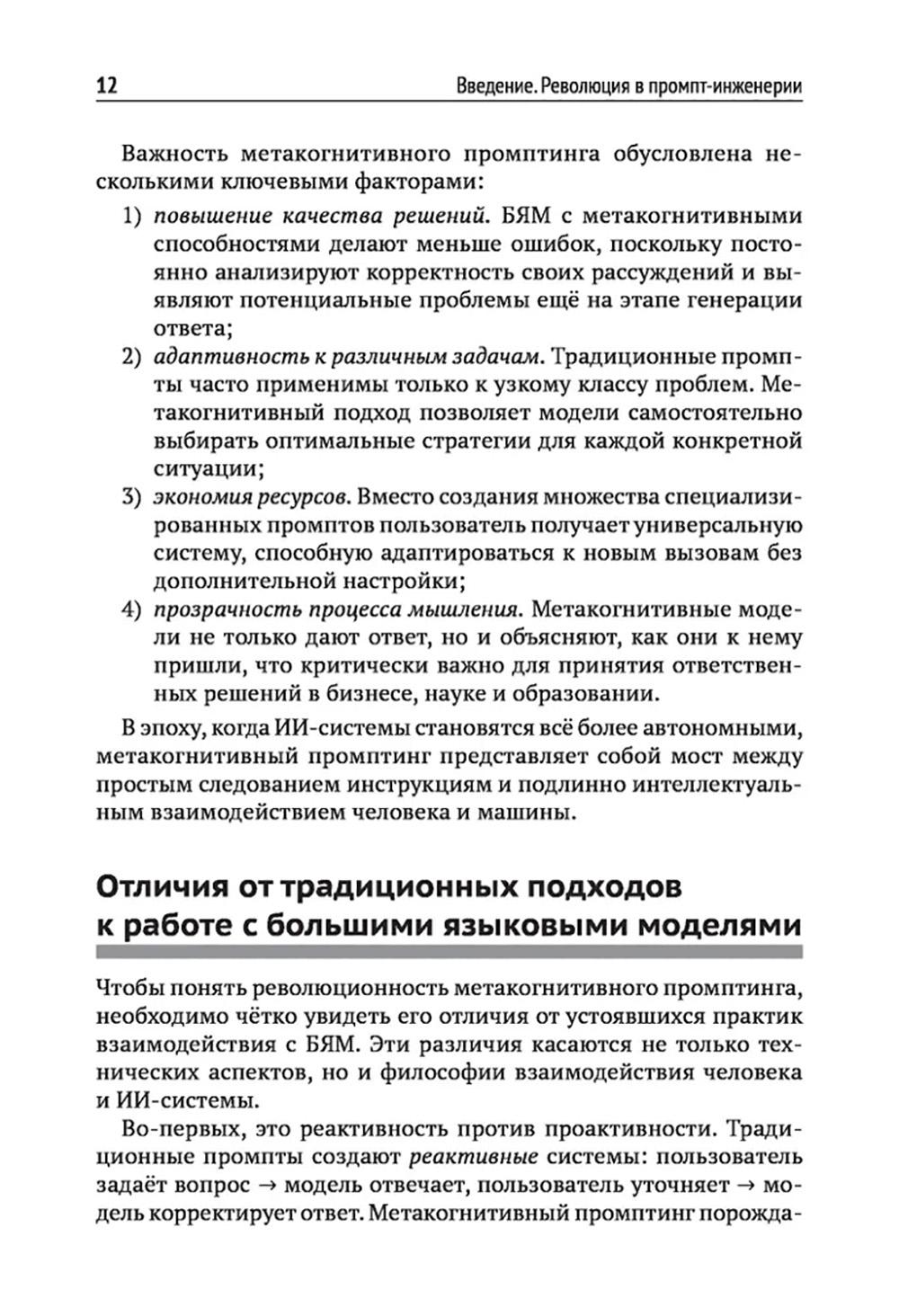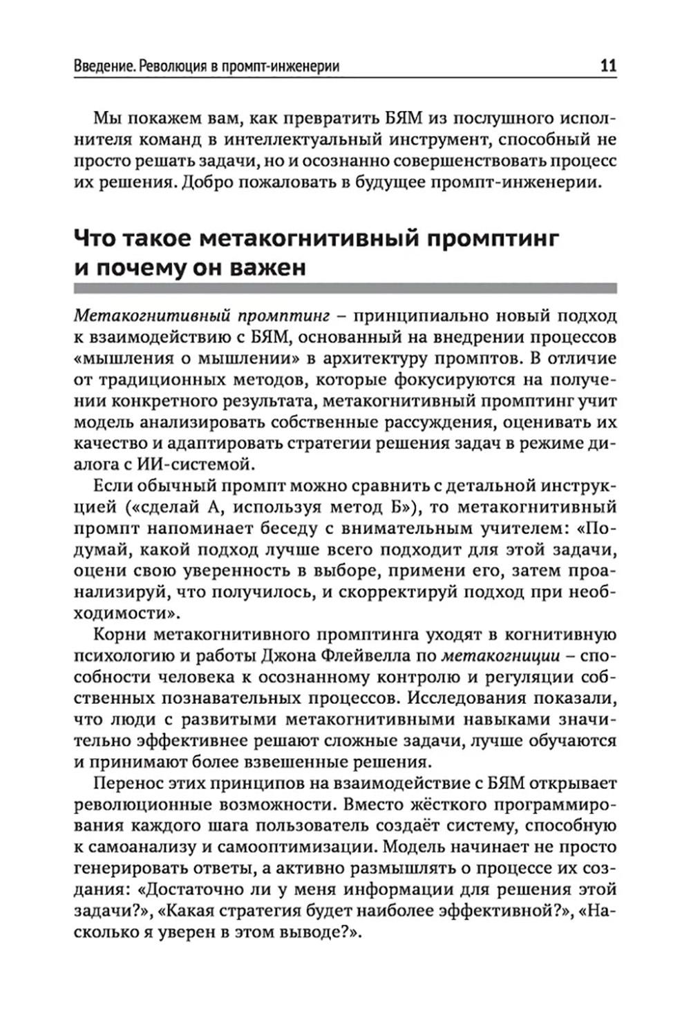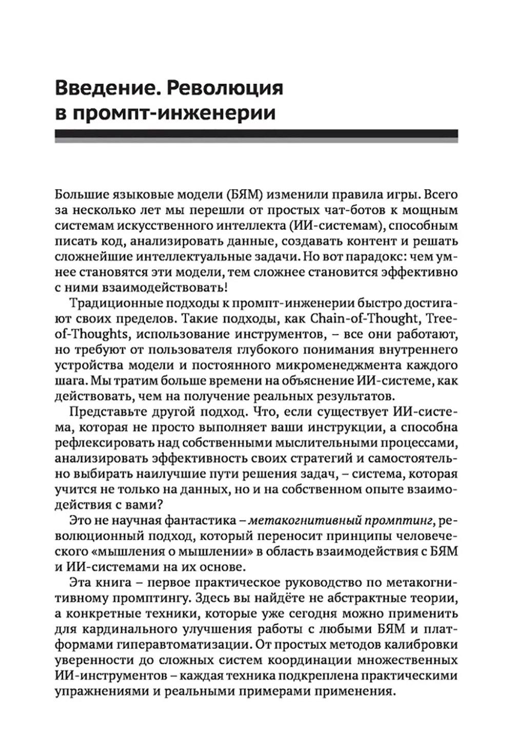 Как научить искусственный интеллект думать о своём собственном мышлении - практическое руководство по новому поколению техник взаимодействия с большими языковыми моделями. Новый подход к работе с генеративным искусственным интеллектом, в рамках которого большие языковые модели превращаются в поистине интеллектуальных помощников, способных анализировать собственное мышление. В книге детально рассматриваются: - метакалибровка собственной уверенности, - мониторинг качества ответов, - саморефлексия и планирование, - продвинутые и адаптивные техники промптинга - и многие другие техники метакогниции, адаптированные для работы с ГенИИ. Издание предназначено разработчикам интеллектуальных систем, аналитикам, исследователям и всем, кто профессионально работает с ИИ-системами, а также тем, кто хочет узнать, куда движется развитие искусственного интеллекта.| Издательство | ДМК |