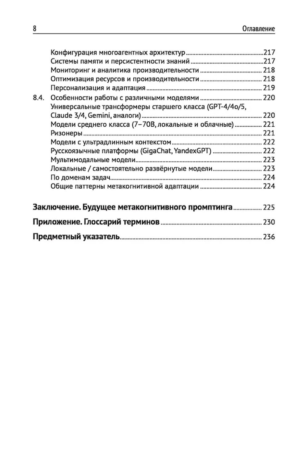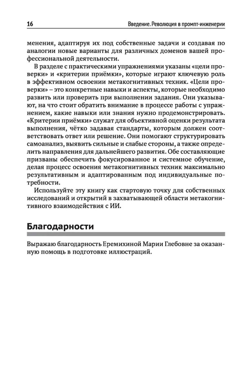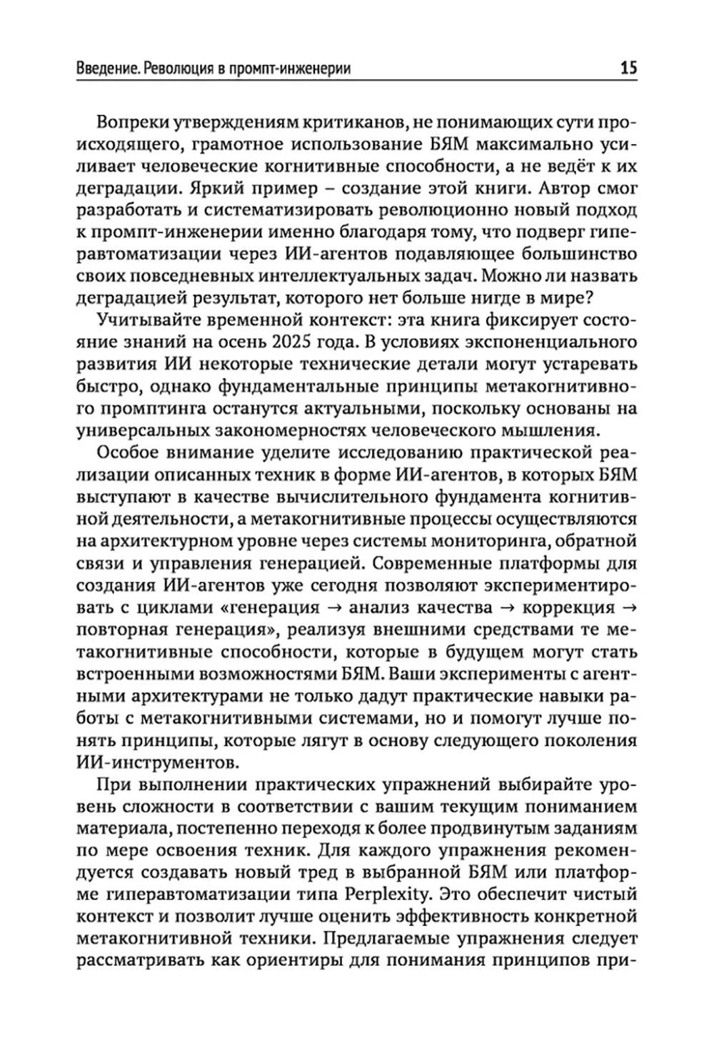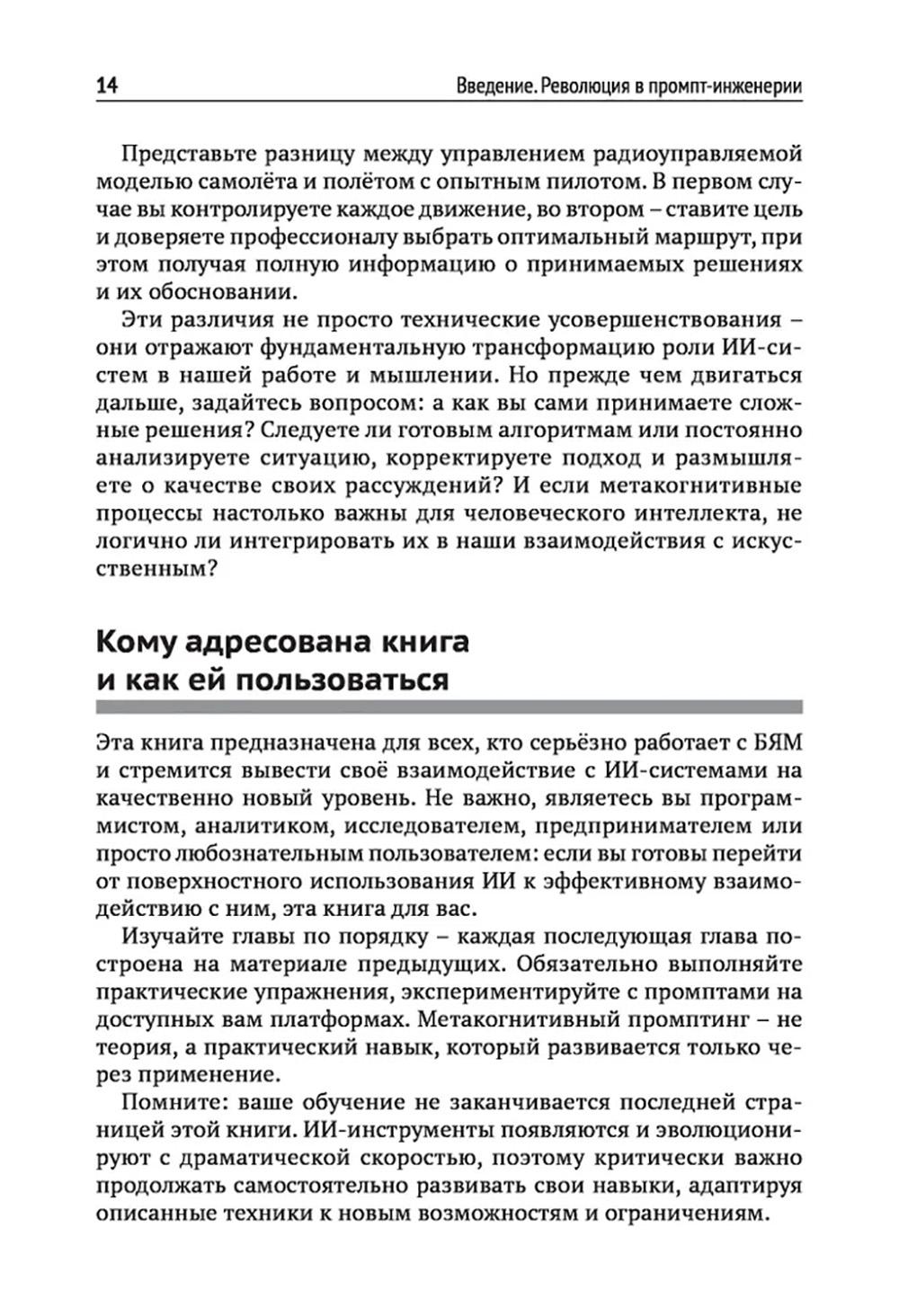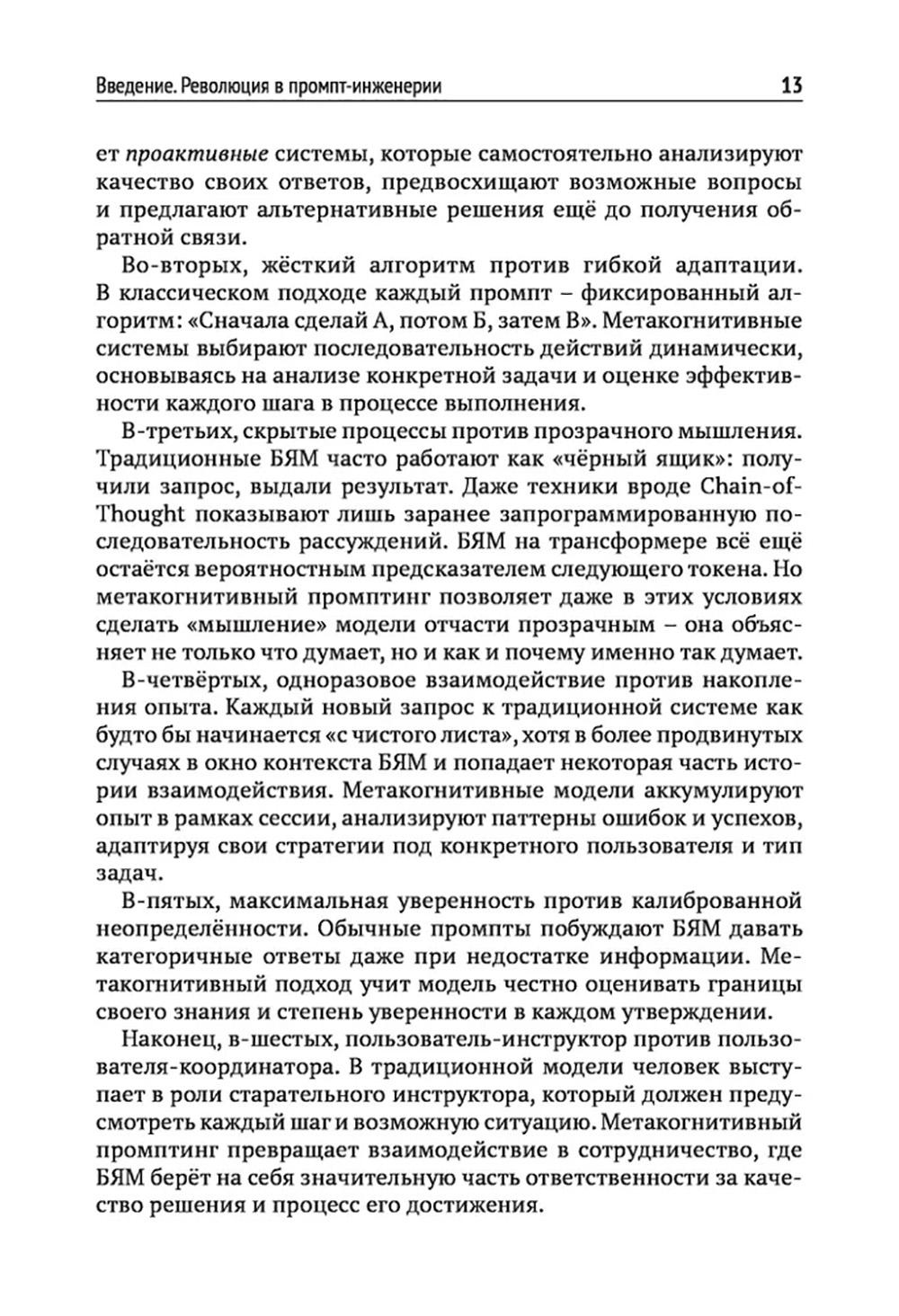 Как научить искусственный интеллект думать о своём собственном мышлении - практическое руководство по новому поколению техник взаимодействия с большими языковыми моделями. Новый подход к работе с генеративным искусственным интеллектом, в рамках которого большие языковые модели превращаются в поистине интеллектуальных помощников, способных анализировать собственное мышление. В книге детально рассматриваются: - метакалибровка собственной уверенности, - мониторинг качества ответов, - саморефлексия и планирование, - продвинутые и адаптивные техники промптинга - и многие другие техники метакогниции, адаптированные для работы с ГенИИ. Издание предназначено разработчикам интеллектуальных систем, аналитикам, исследователям и всем, кто профессионально работает с ИИ-системами, а также тем, кто хочет узнать, куда движется развитие искусственного интеллекта.| Издательство | ДМК |