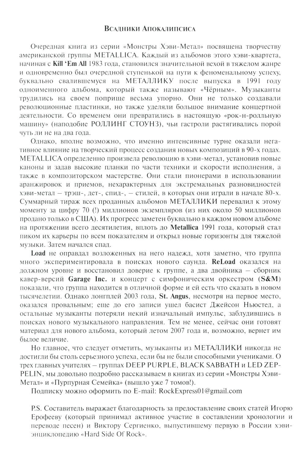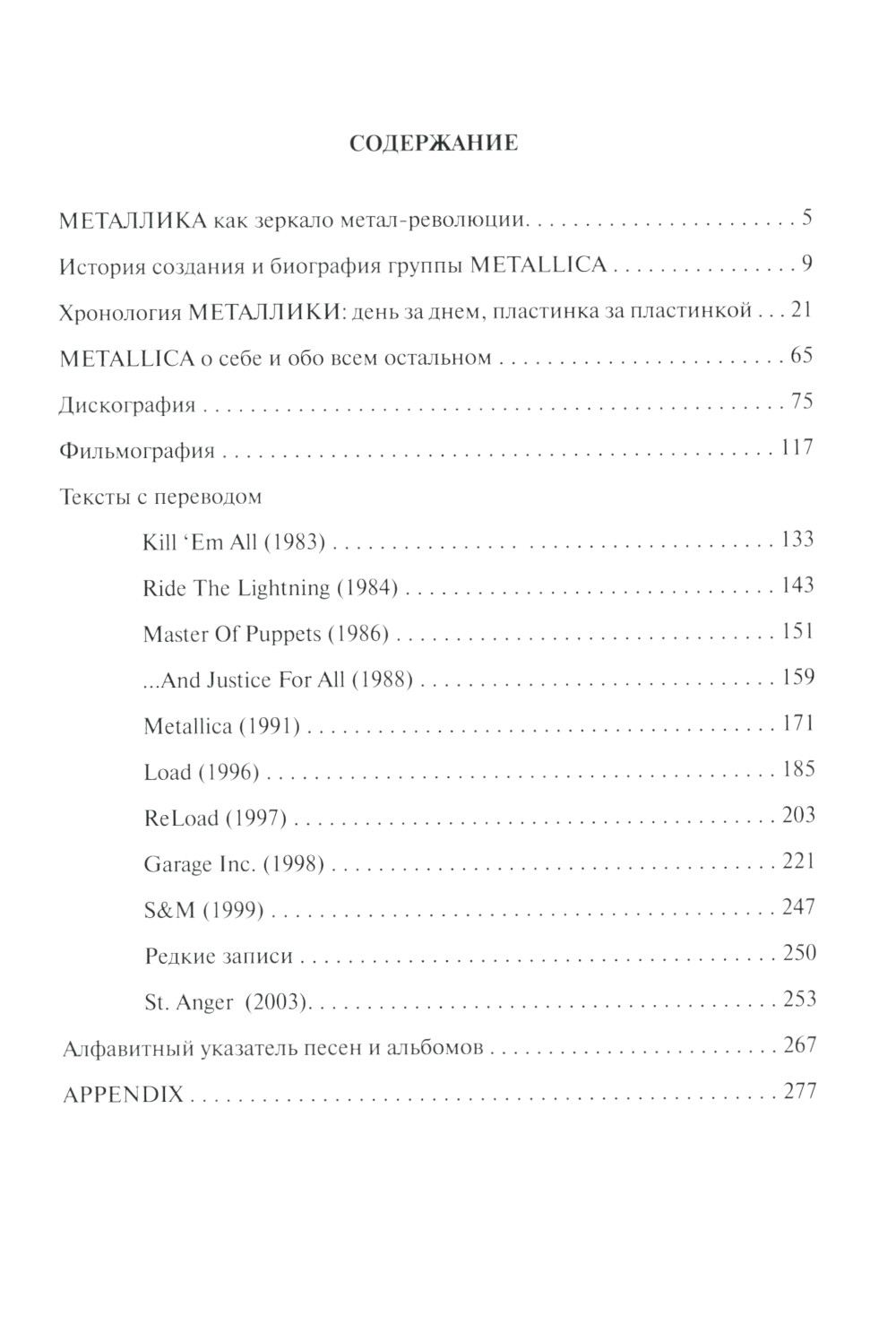 Справочное издание, посвященное творчеству легендарной американской хэви-группы METALLICA. В книгу вошли: хронология, подробная дискография, фильмография, а также тексты песен с переводом. Предназначена для широкого круга поклонников современной рок-музыки.