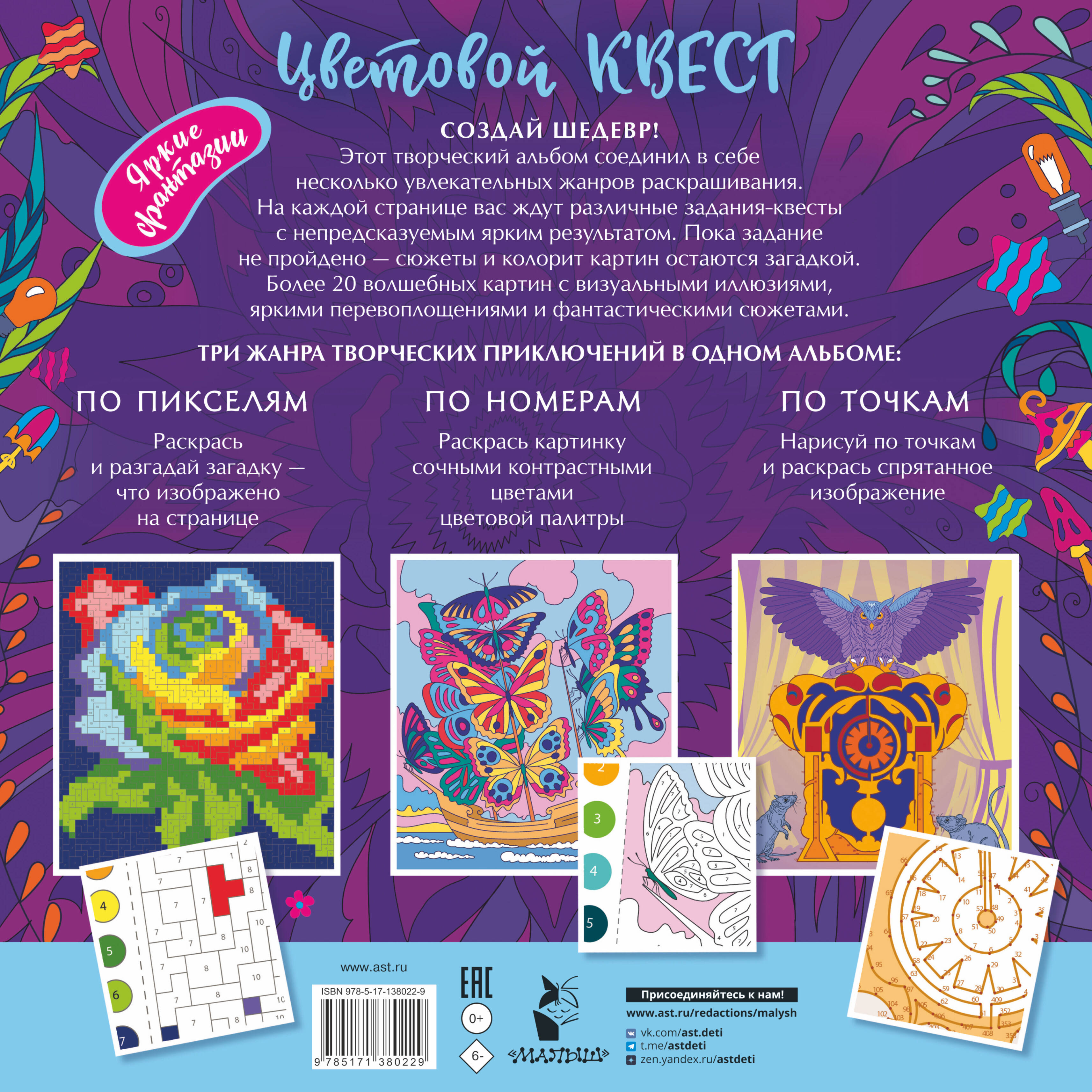 СОЗДАЙ ШЕДЕВР! Все самые популярные арт-квесты в одном издании. Этот творческий альбом объединяет несколько увлекательных жанров раскрашивания. На каждой странице вас ждут различные задания-квесты с непредсказуемым ярким результатом. Пока задание не пройдено - сюжеты и колорит картин остаются загадкой. ТРИ ЖАНРА ТВОРЧЕСКИХ ПРИКЛЮЧЕНИЙ В ОДНОМ АЛЬБОМЕ: - ПО ПИКСЕЛЯМ - Раскрась и разгадай загадку - что изображено на странице - ПО НОМЕРАМ - Раскрась картинку сочными контрастными цветами цветовой палитры - ПО ТОЧКАМ - Нарисуй по точкам и раскрась спрятанное изображение| Издательство | АСТ |