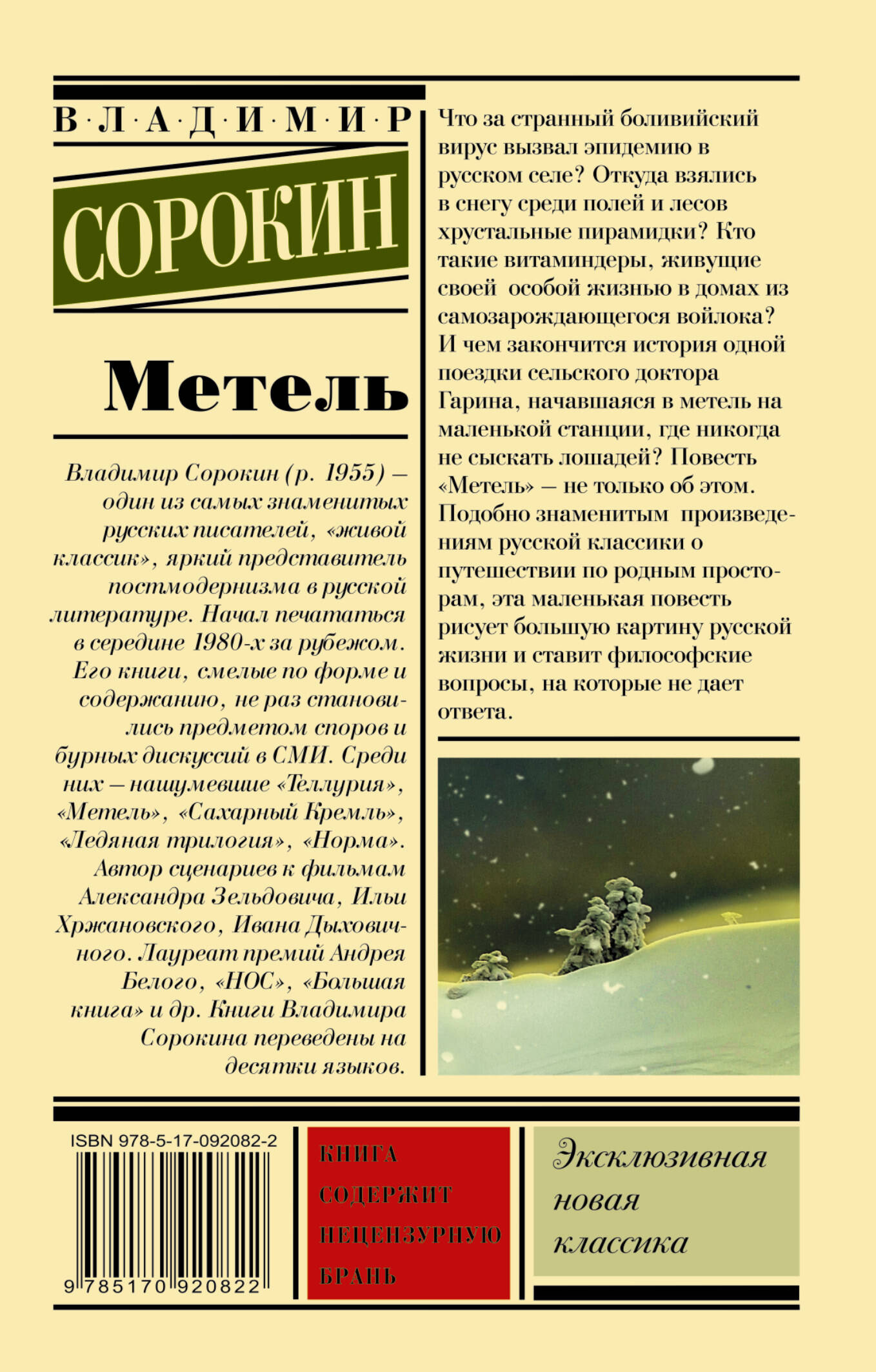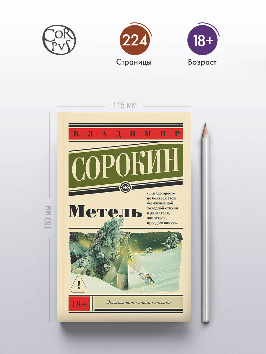 Что за странный боливийский вирус вызвал эпидемию в русском селе? Откуда взялись в снегу среди полей и лесов хрустальные пирамидки? Кто такие витаминдеры, живущие своей, особой жизнью в домах из самозарождающегося войлока? И чем закончится история одной поездки сельского доктора Гарина, начавшаяся в метель на маленькой станции, где никогда не сыскать лошадей? Повесть Владимира Сорокина не только об этом. Поэтичная, краткая и изысканная "Метель" стоит особняком среди книг автора. Подобно знаменитым произведениям русской классики о путешествии по родным просторам, эта маленькая повесть рисует большую картину русской жизни и ставит философские вопросы, на которые не дает ответа.| Издательство | Издательство "АСТ" |