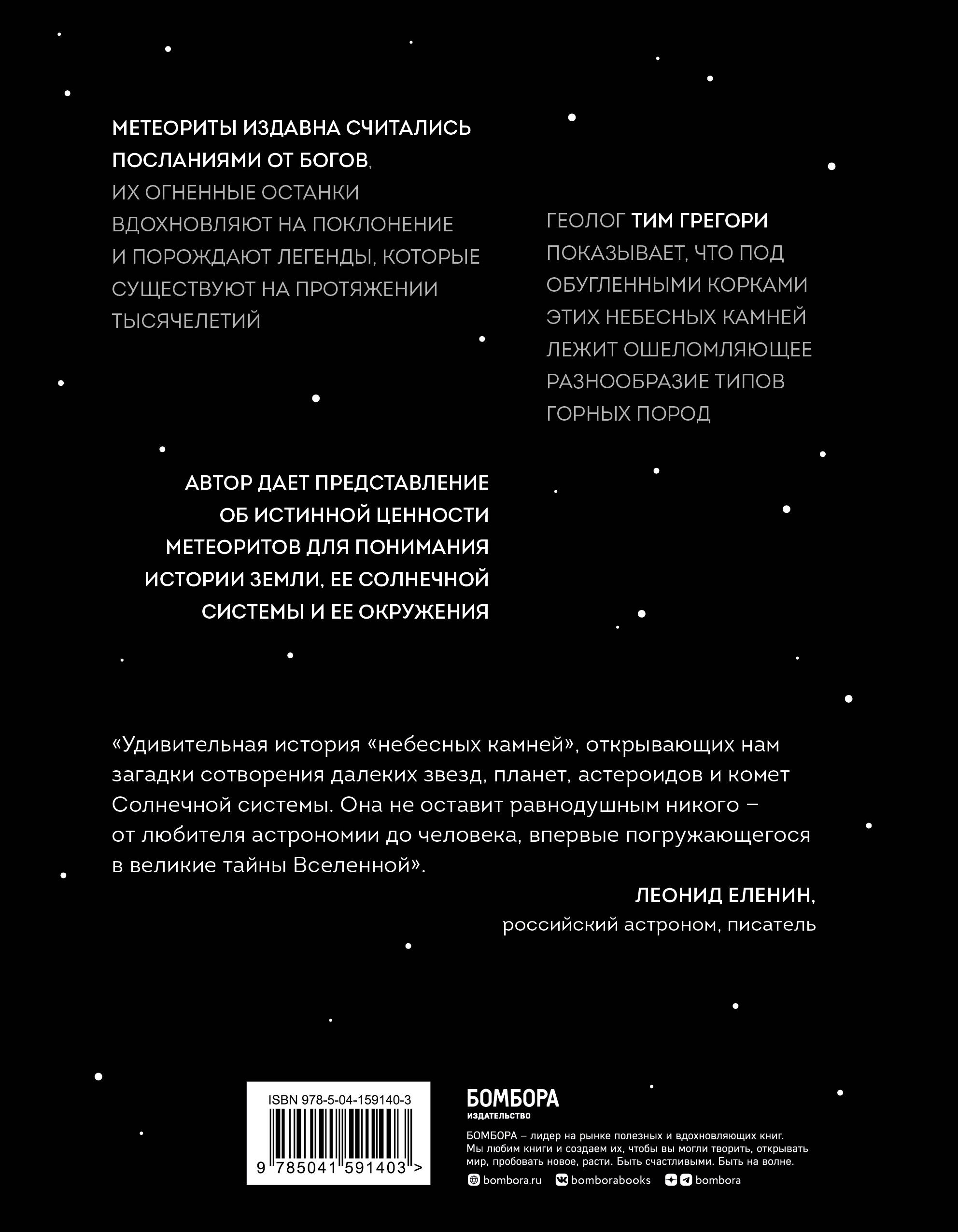 Метеориты издавна считались посланиями от богов, их огненные останки вдохновляют на поклонение и порождают легенды, которые существуют на протяжении тысячелетий. Но помимо предания, метеориты рассказывают еще большую историю: историю нашей Солнечной системы. Геолог Тим Грегори показывает, что под обугленными корками этих небесных камней лежит ошеломляющее разнообразие типов горных пород. Их уникальные составляющие, яркие цвета и резкие запахи содержат захватывающие истории о межзвездных облаках, конденсирующейся звездной пыли и огненных столкновениях целых миров.| Издательство | ООО "Издательство "Эксмо" |