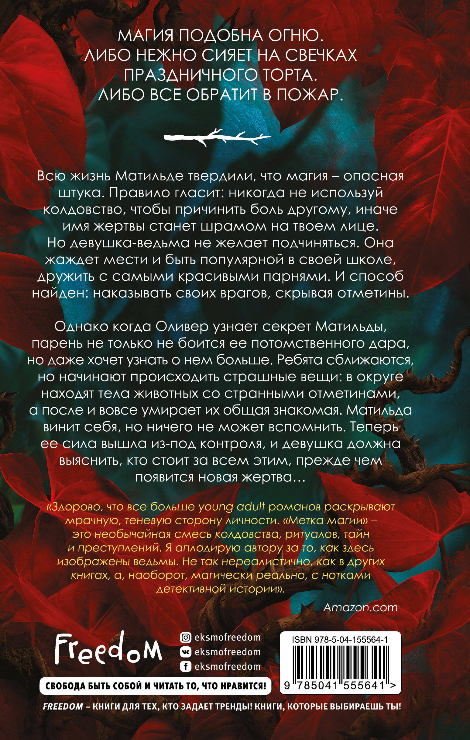 Темное мистическое фэнтези от английской писательницы Джорджии Бауэрс - уникальный коктейль из магии, проклятий и тайн маленького городка. Матильда - ведьма, но ее магия не дает ей остаться безнаказанной и награждает шрамами. Как долго она сможет сдержать свою страшную силу? Или коварные чары окажутся смертельными для нее самой? Роман о магии, которую нужно держать под контролем, иначе придет конец дружбе, спокойной жизни, а это приведет к ужасным последствиям. О девушке, которая не виновата в том, что обладает силой - она досталась ей от родителей, а сама Матильда испытывает те же проблемы, что и обычные подростки: с трудом заводит друзей, считает всех врагами и чувствует себя одинокой. Джорджия Бауэрс живет в Бедфорде, небольшом провинциальном городке в Англии. Она всегда была одержима двумя вещами: книгами и Баффи - истребительницей вампиров. В юности ей нравилась серия книг Point Horrors - она утоляла ее жажду леденящих кровь сказок. Затем Джорджия перешла к чтению Стивена Кинга. Ее завораживающие истории всегда мрачны, но прекрасны, как и ее любовь к писательству. Мрачный саспенс держит читателя в напряжении от самого начала и до конца, вызывая все большие вопросы: кто виноват? Где правда, а где вымысел? Чего еще ждать от сверхъестественной силы? Повороты сюжета, глубина характеров, запутанная история любви, колдовская магия - мурашки по коже!| Издательство | ООО "Издательство "Эксмо" |