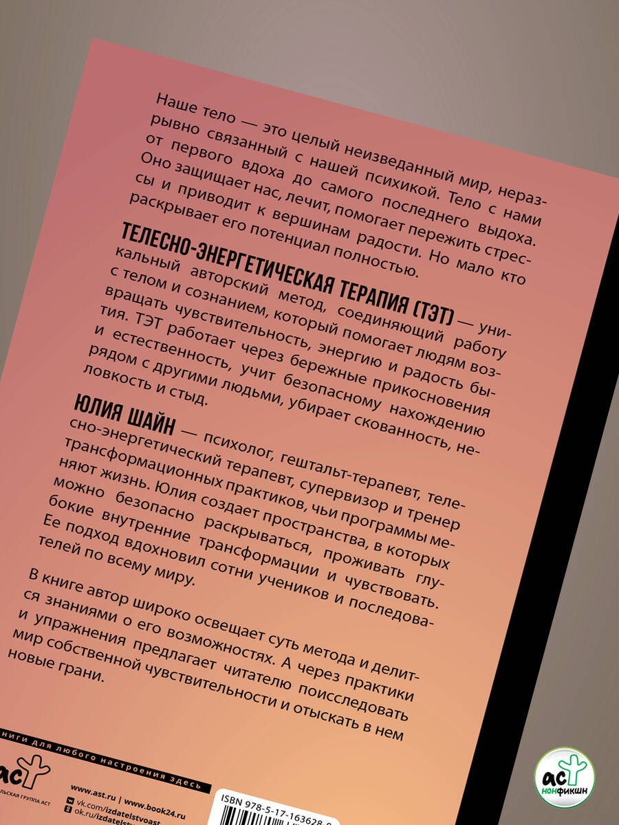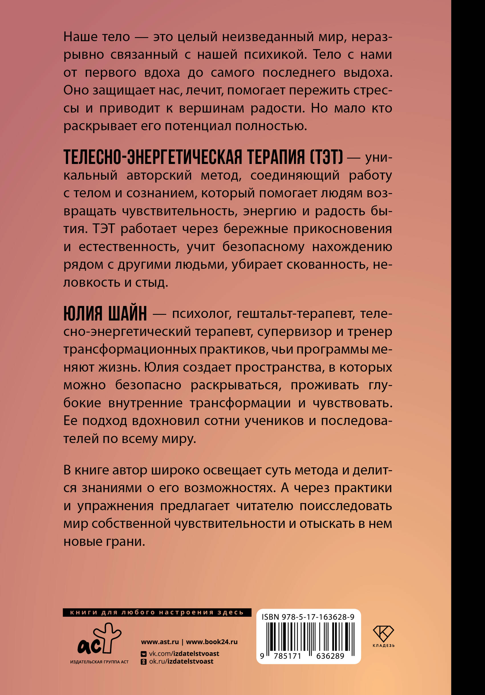 Наше тело - это целый неизведанный мир, неразрывно связанный с нашей психикой. Тело с нами от первого вдоха до самого последнего выдоха. Оно защищает нас, лечит, помогает пережить стрессы и приводит к вершинам радости. Но мало кто раскрывает его потенциал полностью. Телесно-энергетическая терапия (ТЭТ) - уникальный авторский метод, соединяющий работу с телом и сознанием, который помогает людям возвращать чувствительность, энергию и радость бытия. ТЭТ работает через бережные прикосновения и естественность, учит безопасному нахождению рядом с другими людьми, убирает скованность, неловкость и стыд. Юлия Шайн - психолог, гештальт-терапевт, телесно-энергетический терапевт, супервизор и тренер трансформационных практиков, чьи программы меняют жизнь. Юлия создает пространства, в которых можно безопасно раскрываться, проживать глубокие внутренние трансформации и чувствовать. Ее подход вдохновил сотни учеников и последователей по всему миру. В книге автор широко освещает суть метода и делится знаниями о его возможностях. А через практики и упражнения предлагает читателю поисследовать мир собственной чувствительности и отыскать в нем новые грани.| Издательство | Издательство "АСТ" |