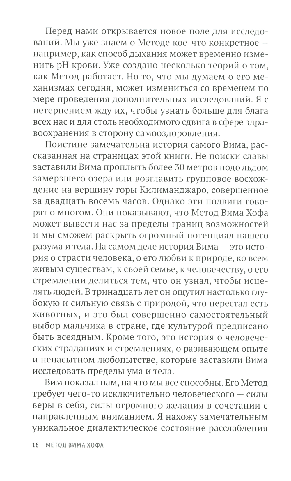 Вим Хоф по прозвищу Ледяной Человек - живая сенсация последних лет. Он восходит на Килиманджаро в одних шортах, пробегает полумарафон за Полярным кругом, может 110 минут просидеть в воде со льдом и 23 секунды провисеть на одном среднем пальце. Человек-уникум? Сам Вим Хоф утверждает, что таких, и даже лучших, результатов может достичь каждый, регулярно занимаясь саморазвитием по его Методу - подвергая себя воздействию холода, выполняя специальные дыхательные упражнения и практикуя позитивный мысленный настрой. Метод Вима Хофа прост и не требует никаких финансовых затрат, а его эффективность подтверждена восемью университетскими исследованиями. В этой книге Ледяной Человек рассказывает свою историю и подробно объясняет Метод, который, как он верит, способен «изменить весь наш мир, одну душу за другой».