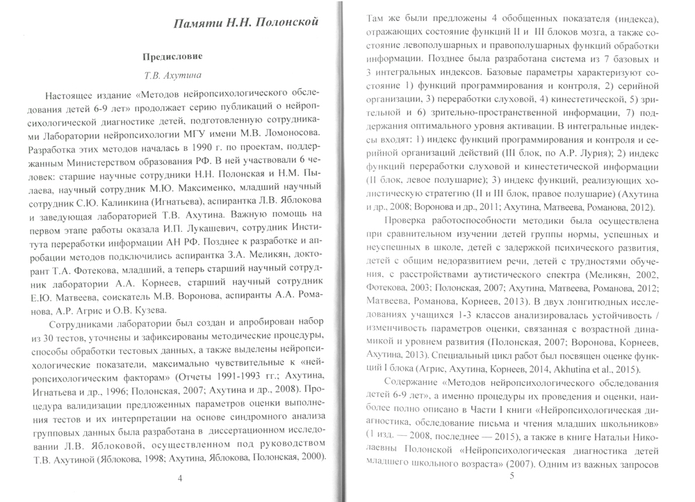 В коллективной монографии представлены «Методы нейропсихологического обследования детей 6-9 лет», разрабатываемые сотрудниками Лаборатории нейропсихологии МГУ имени М.В. Ломоносова с 1990 года. Нейропсихологические методы диагностики состояния высших психических функций позволяют. уточнять механизмы трудностей обучения и на этой основе строить коррекционно-развивающую работу, направленную на преодоление отставания в освоении основных общеобразовательных программ. В книге описаны процедуры проведения и оценки нейропсихологических тестов, представлены количественные и качественные данные о выполнении проб 296 первоклассниками разных московских школ (общие данные и средние по школам), описаны способы обобщения данных и составления заключения.