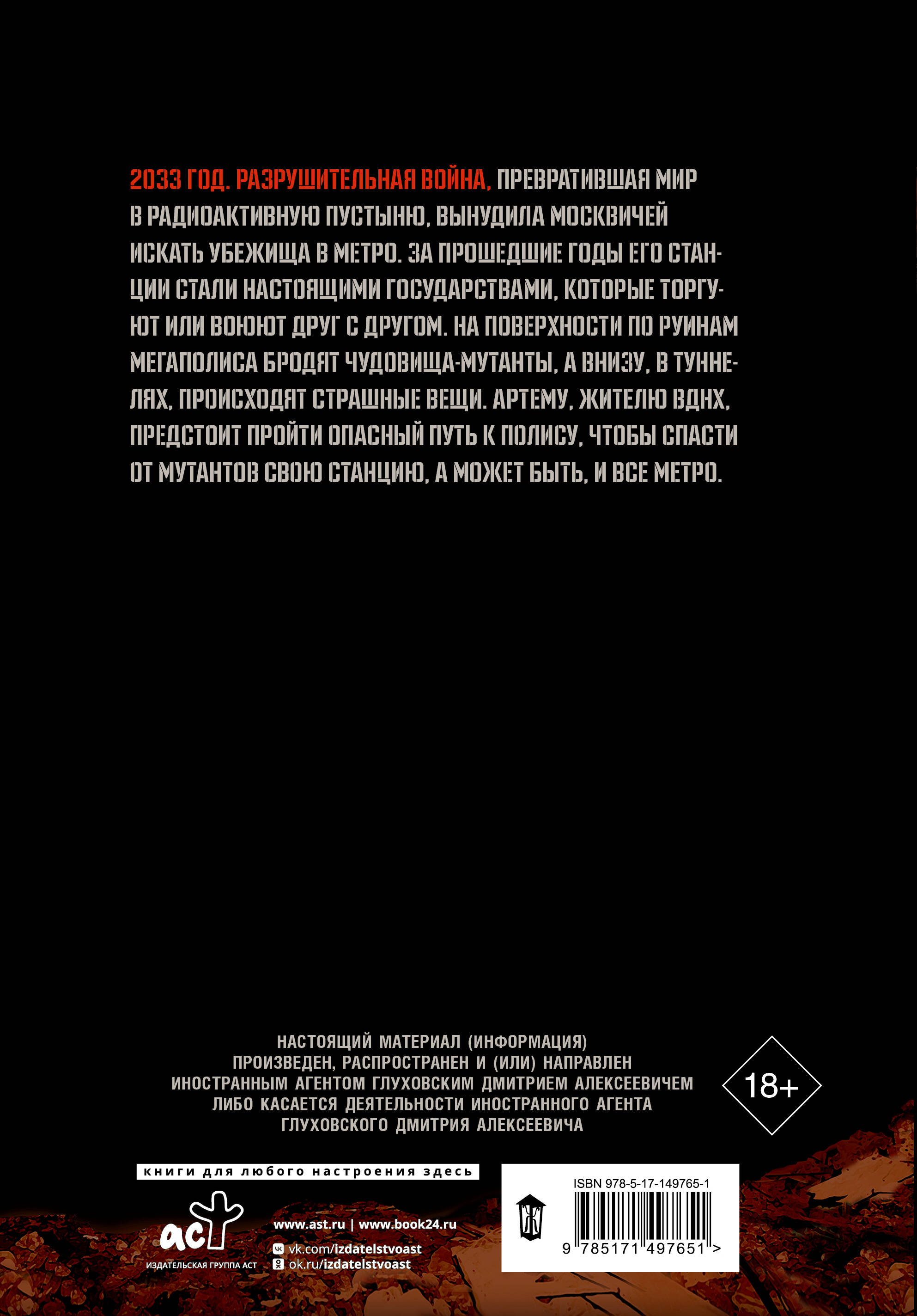 18+ НАСТОЯЩИЙ МАТЕРИАЛ (ИНФОРМАЦИЯ) ПРОИЗВЕДЁН, РАСПРОСТРАНЕН И (ИЛИ) НАПРАВЛЕН ИНОСТРАННЫМ АГЕНТОМ ГЛУХОВСКИМ ДМИТРИЕМ АЛЕКСЕЕВИЧЕМ ЛИБО КАСАЕТСЯ ДЕЯТЕЛЬНОСТИ ИНОСТРАННОГО АГЕНТА ГЛУХОВСКОГО ДМИТРИЯ АЛЕКСЕЕВИЧА 2033 год. Разрушительная война, превратившая мир в радиоактивную пустыню, вынудила москвичей искать убежища в метро. За прошедшие годы его станции стали настоящими государствами, которые торгуют или воюют друг с другом. На поверхности по руинам мегаполиса бродят чудовища-мутанты, а внизу, в туннелях, происходят страшные вещи. Артему, жителю ВДНХ, предстоит пройти опасный путь к Полису, чтобы спасти от мутантов свою станцию, а может быть, и все метро.