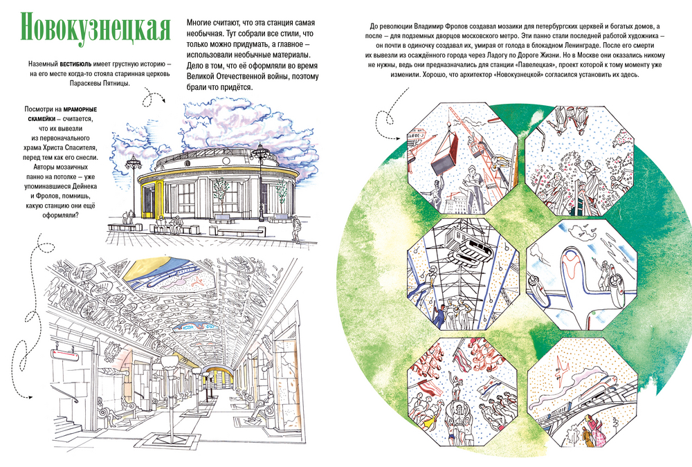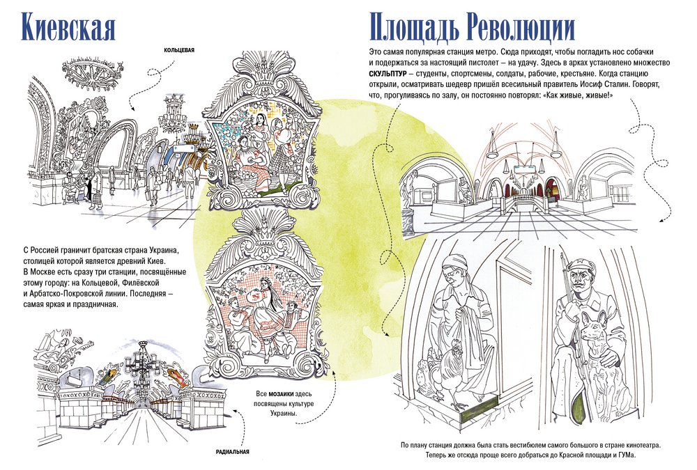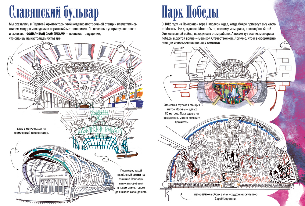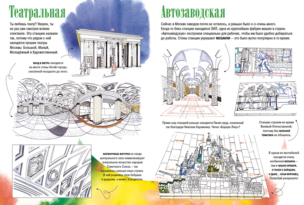 Раскраска-путеводитель настоящая сокровищница для творческих и активных детей. Благодаря интересному формату ребенок с интересом изучит московское метро, его главные достопримечательности, уникальные символы, запомнит новые маршруты. Просто возьмите раскраску в дорогу и вместе изучайте знакомые станции. Во время обеда или отдыха в парке пока ребенок раскрашивает картинки, попросите его рассказать об увиденном за день: что ему больше всего запомнилось, что ему хочется еще посетить.