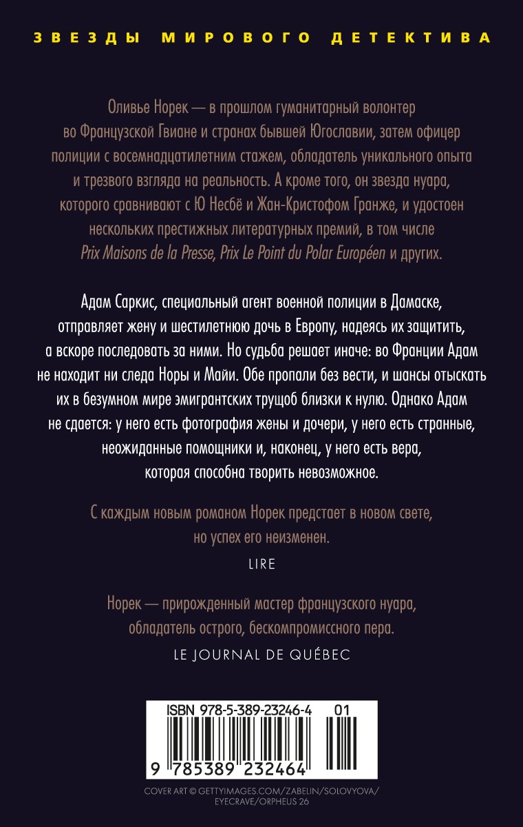 Оливье Норек - в прошлом гуманитарный волонтер во Французской Гвиане и странах бывшей Югославии, затем офицер полиции с восемнадцатилетним стажем, обладатель уникального опыта и трезвого взгляда на реальность. А кроме того, он звезда нуара, которого сравнивают с Ю Несбё и Жан-Кристофом Гранже, и удостоен нескольких престижных литературных премий, в том числе Grand Prix des Lectrices de ELLE, Prix Maisons de la Presse, Prix Le Point du Polar Européen, Étoile du Parisien du meilleur polar и других. Адам Саркис, специальный агент военной полиции в Дамаске, отправляет жену и шестилетнюю дочь в Европу, надеясь защитить их от смертельной опасности, а вскоре последовать за ними. Но судьба решает иначе: прибыв во Францию, Адам не находит ни следа Норы и Майи. Самые дорогие Адаму люди пропали без вести, и шансы отыскать их в безумном, жестоком мире эмигрантских трущоб близки к нулю. Однако Адам не теряет надежды: у него есть фотография жены и дочери, у него есть странные, неожиданные помощники и, наконец, у него есть вера, которая способна творить невозможное.| Издательство | Азбука |