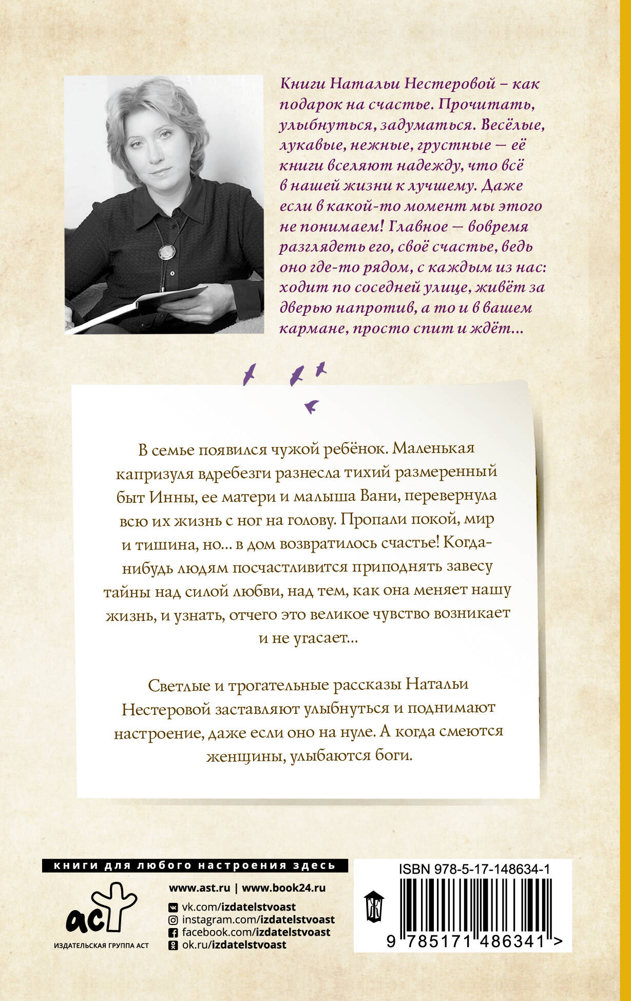 Светлые и трогательные рассказы Натальи Нестеровой заставляют улыбнуться и поднимают настроение, даже если оно на нуле. А когда смеются женщины, улыбаются боги. Книги Натальи Нестеровой - как подарок на счастье. Прочитать, улыбнуться, задуматься. Весёлые, лукавые, нежные, грустные - её книги вселяют надежду, что всё в нашей жизни к лучшему. Даже если в какой-то момент мы этого не понимаем! Главное - вовремя разглядеть его, своё счастье, ведь оно где-то рядом, с каждым из нас: ходит по соседней улице, живёт за дверью напротив, а то и в вашем кармане, просто спит и ждёт… В семье появился чужой ребёнок. Маленькая капризуля вдребезги разнесла тихий размеренный быт Инны, её матери и малыша Вани, перевернула всю их жизнь с ног на голову. Пропали покой, мир и тишина, но… в дом возвратилось счастье! Когда-нибудь людям посчастливиться приподнять завесу тайны над силой любви, над тем, как она меняет нашу жизнь, и узнать, отчего это великое чувство возникает и не угасает…| Издательство | АСТ |