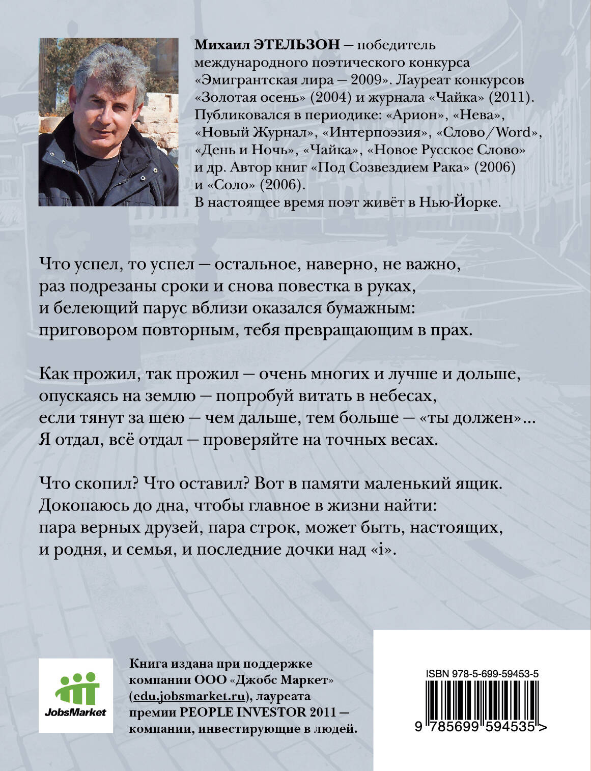 Михаил Этельзон родился в 1959 году в Виннице. С 1977 по 1989 учился и работал в Ленинграде. Окончил Ленинградский политехнический институт и Московский институт патентной экспертизы. Победитель международного поэтического конкурса "Эмигрантская лира - 2009". Лауреат поэтических конкурсов "Золотая осень" (2004) и журнала "Чайка" (2011). Публиковался в многочисленных сборниках стихов, а также в периодике: "Арион", "Нева", "Новый Журнал", "Интерпоэзия", "Слово/Word", "День и Ночь", "Чайка", "Новое Русское Слово", и др. Автор книг: "Под Созвездием Рака" (2006) и "Соло" (2006). В настоящее время поэт живёт в Нью-Йорке. В новую книгу поэта Михаила Этельзона вошло более 160 стихотворений, в основном написанных после 2006 г. В книге также представлены избранные стихи из ранее изданных книг "Соло" и "Под Созвездием Рака", многие из которых стали визитными карточками автора. Автор выражает особую благодарность Алле Носковой, генеральному директору ООО "Джобс Маркет", за неоценимую помощь и поддержку, оказанную при издании этой книги, а также художнику Mawerick, за прекрасные иллюстрации, удивительно созвучные по духу и стилю поэзии, представленной в книге.| Издательство | ООО "Издательство "Эксмо" |