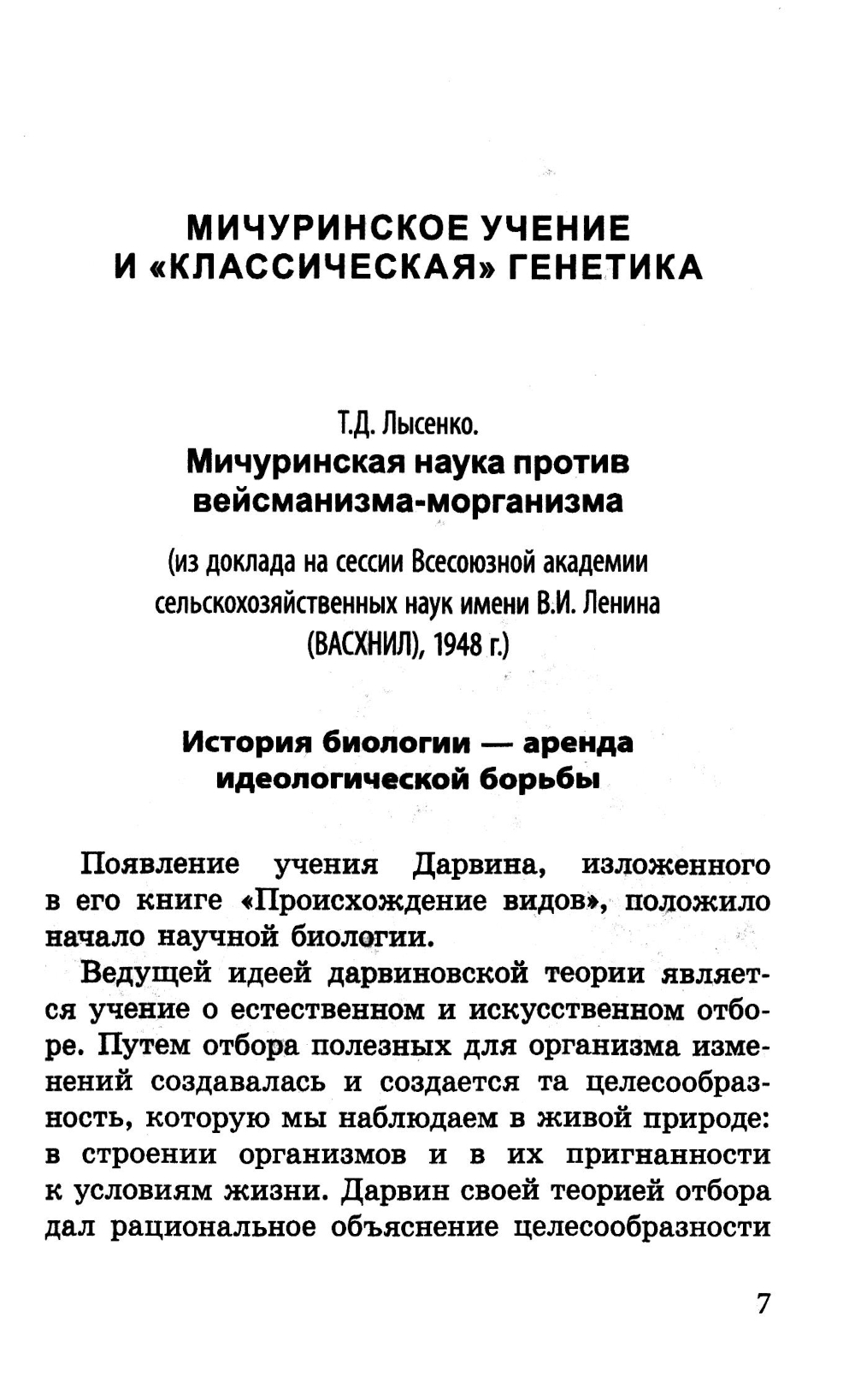 В 1930-х - 1940-х годах в биологии развернулась острая дискуссия между сторонниками «классической» генетики и мичуринского учения. «Классические» генетики, называемые в СССР «вейсманистами-органистами» по именам немецкого зоолога Августа Вейсмана и американского биолога Томаса Моргана, заняли ведущее положение во многих научных и образовательных учреждениях страны. В защиту мичуринского учения выступил Трофим Денисович Лысенко - агроном и биолог, лауреат трех Сталинских премий первой степени. Своими опытами он доказал превосходство мичуринской науки: так, газета «Монд» указывала, что этими опытами нанесен смертельный удар теории Моргана и Вейсмана. В то же время коллеги Т. Д. Лысенко опровергли основные положения вейсманизма-морганизма как на практике, так и в теории. В книге представлены статьи и выступления Т. Д. Лысенко и других ученых мичуринской школы, доказывающих, что «под напором фактов представители «классической» генетики вынуждены отказываться от ряда своих позиций, которые еще недавно выдавались за важнейшие завоевания науки. Победа на стороне мичуринской генетики».| Издательство | Родина |