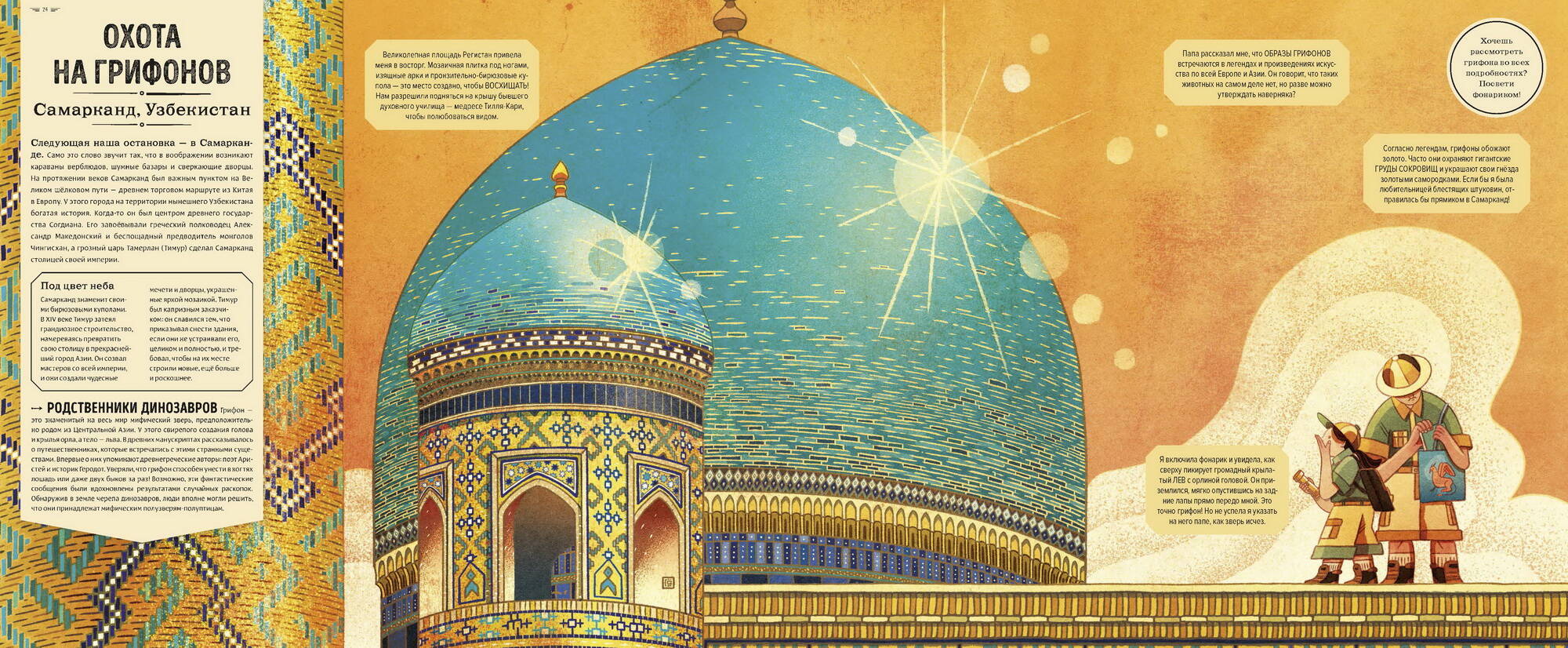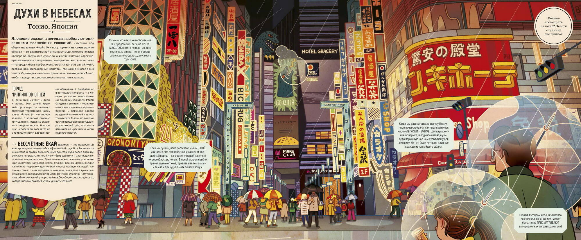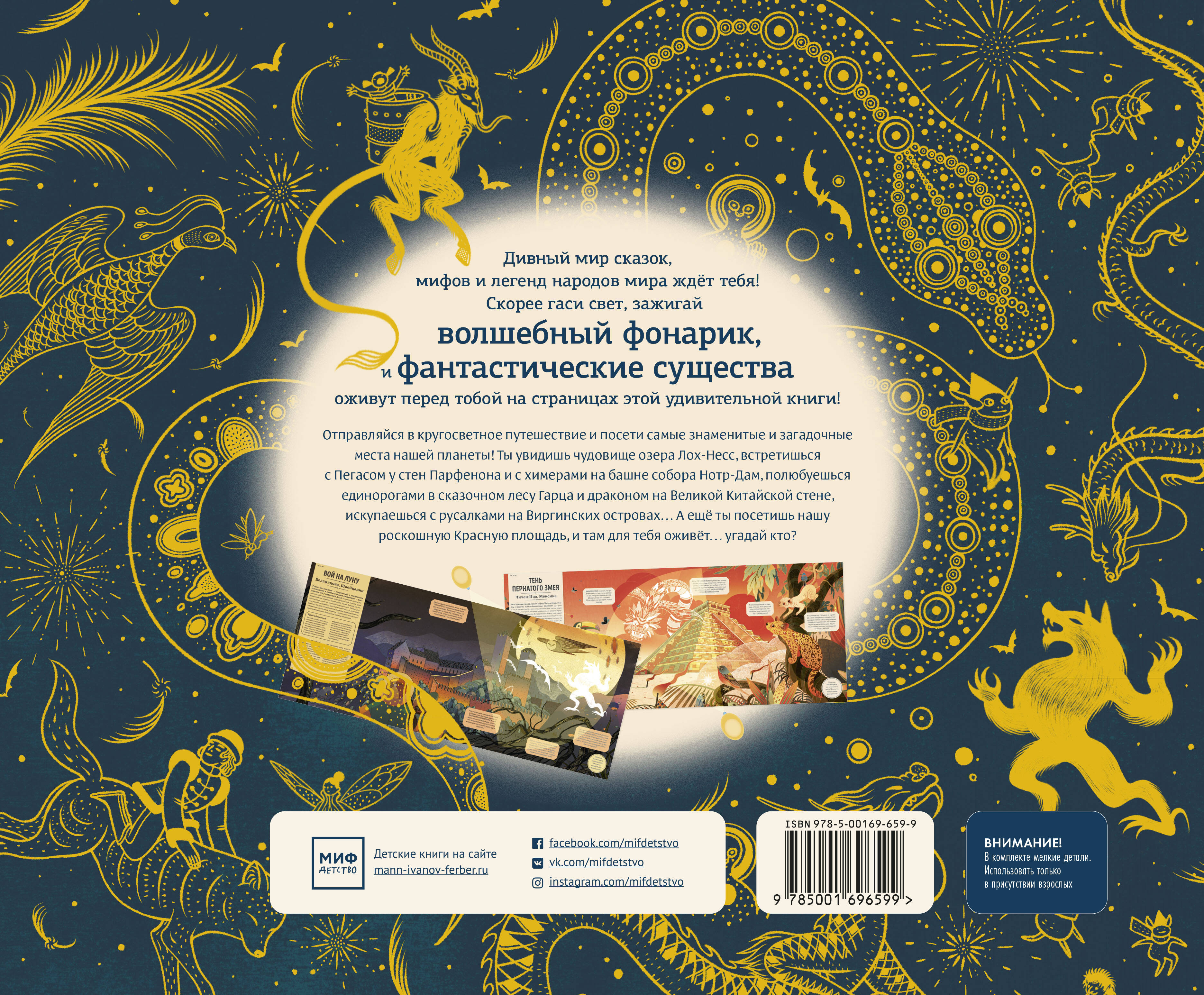 Книга-сказка, на страницах которой оживают фантастические существа. Профессор Байрон Мортимер, известный специалист по фольклору, легендам и мифам народов мира, и его дочка Милли отправляются в кругосветное путешествие. Читатель последует за ними в самые знаменитые и загадочные места нашей планеты, познакомится с древними преданиями, а благодаря волшебному фонарику, сможет увидеть и рассмотреть фантастических существ, которые согласно преданиям, населяли эти края. Увидит чудовище озера Лох-Несс, встретится с Пегасом у стен Парфенона и с химерами на башне собора Нотр-Дам, полюбуется единорогами в сказочном лесу Гарца и драконом на Великой Китайской стене, искупается с русалками на Виргинских островах. Отдельный сюрприз ожидает путешественников в России на Красной площади. Вас ждет более 30 фантастических созданий: в Токио, Самарканде, Нью-Йорке и Оксфорде. Как читать книгу: Читайте по одному развороту перед сном. Рассмотрите достопримечательности страны, о которой прочитали, а потом потушите свет, включите волшебный фонарик и - о чудо! - волшебные существа предстанут перед вами во всем своем великолепии. В конце книги - бонус: кроме фантастических созданий, о которых вы прочитали, на страницах книги спрятаны другие существа. Познакомьтесь с ними! Для кого эта книга: Для детей от 4 лет и их родителей. Отличный подарок друзьям с детьми: WOW-эффект гарантирован!| Издательство | МАНН, ИВАНОВ И ФЕРБЕР ООО |