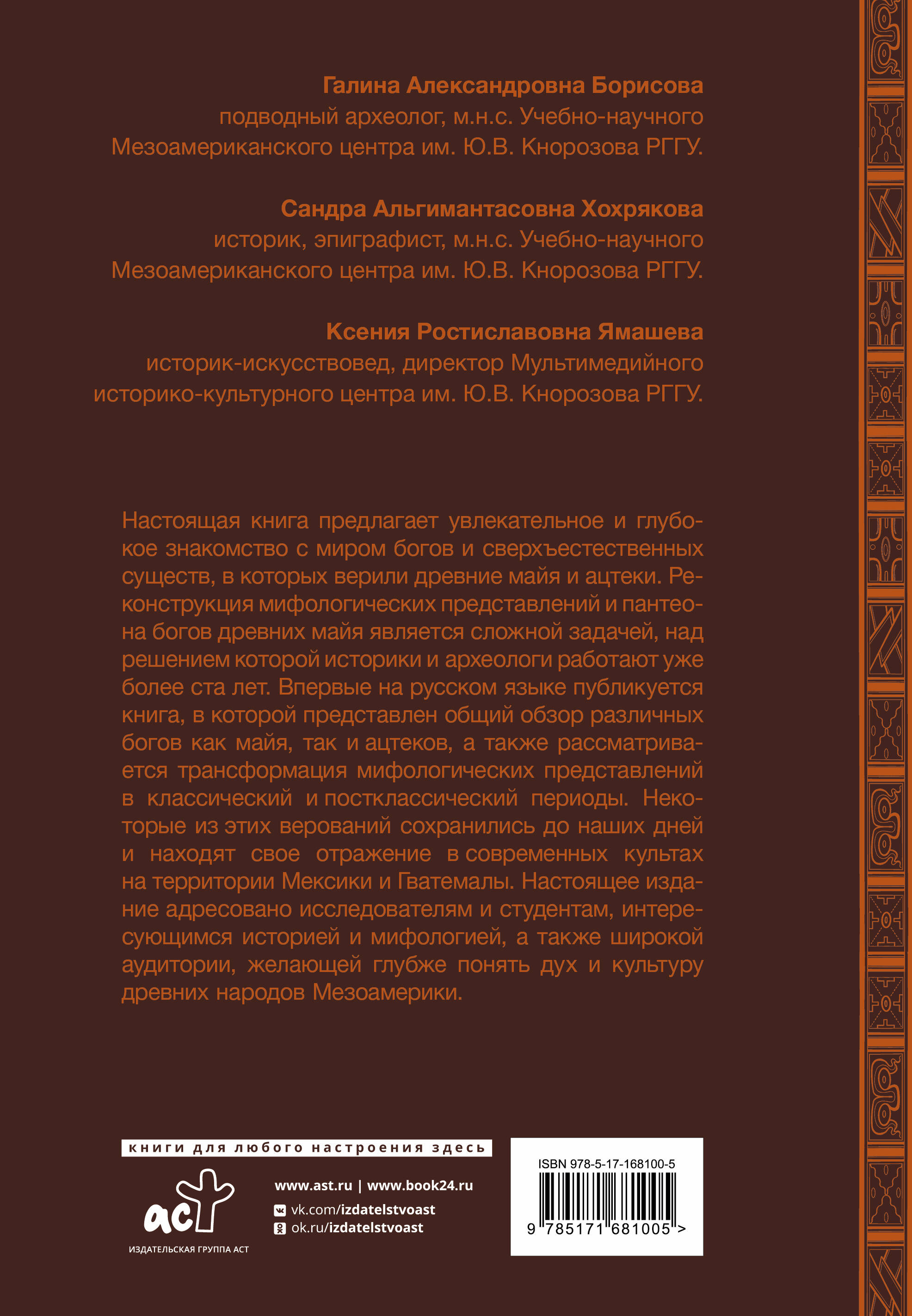 Настоящая книга предлагает увлекательное и глубокое знакомство с миром богов и сверхъестественных существ, в которых верили древние майя и ацтеки. Реконструкция мифологических представлений и пантеона богов древних майя является сложной задачей, над решением которой историки и археологи работают уже более ста лет. Впервые на русском языке публикуется книга, в которой представлен общий обзор различных богов как майя, так и ацтеков, а также рассматривается трансформация мифологических представлений в классический и постклассический периоды. Некоторые из этих верований сохранились до наших дней и находят свое отражение в современных культах на территории Мексики и Гватемалы. Настоящее издание адресовано исследователям и студентам, интересующимся историей и мифологией, а также широкой аудитории, желающей глубже понять дух и культуру древних народов Мезоамерики.| Издательство | Издательство "АСТ" |