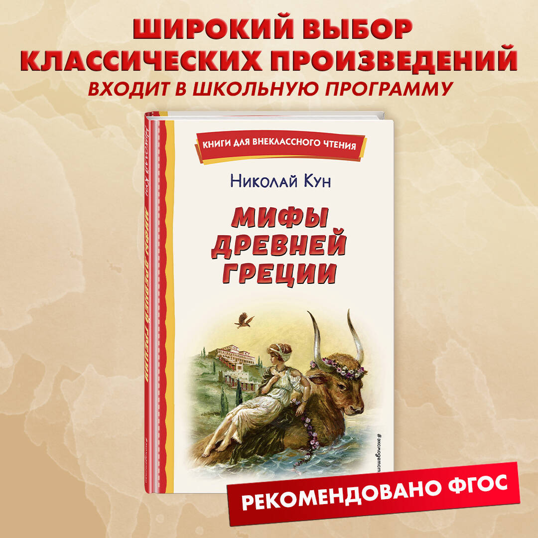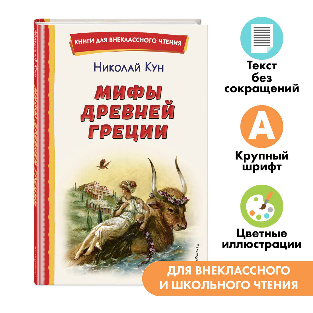 Серия «Книги для внеклассного чтения» - это подборка главных произведений русских и зарубежных авторов, входящих в школьную программу. Лучшие произведения детской литературы с цветными иллюстрациями помогут привить ребенку любовь к чтению. Книга познакомит юного читателя с историей происхождения мира, рождения богов Олимпа и подвигами героев, среди которых Прометей, Персей, Тесей и Орфей. На основе мифов Древней Греции веками развивалась общечеловеческая культура: художники, поэты, скульпторы брали образы и сюжеты для своих произведений из античной мифологии. В нашей речи мы до сих пор используем выражения, которые берут своё начало в Древней Греции: «кануть в Лету», «ящик Пандоры», «Сизифов труд» и другие. Знакомство с мифами позволит ребёнку расширить свой кругозор и окунуться в чарующую атмосферу Древней Греции. Мифы даны в пересказе Николая Альбертовича Куна, исследователя древнегреческой культуры. Иллюстрации в книге Анны Власовой, члена Международной федерации художников.| Издательство | ООО "Издательство "Эксмо" |