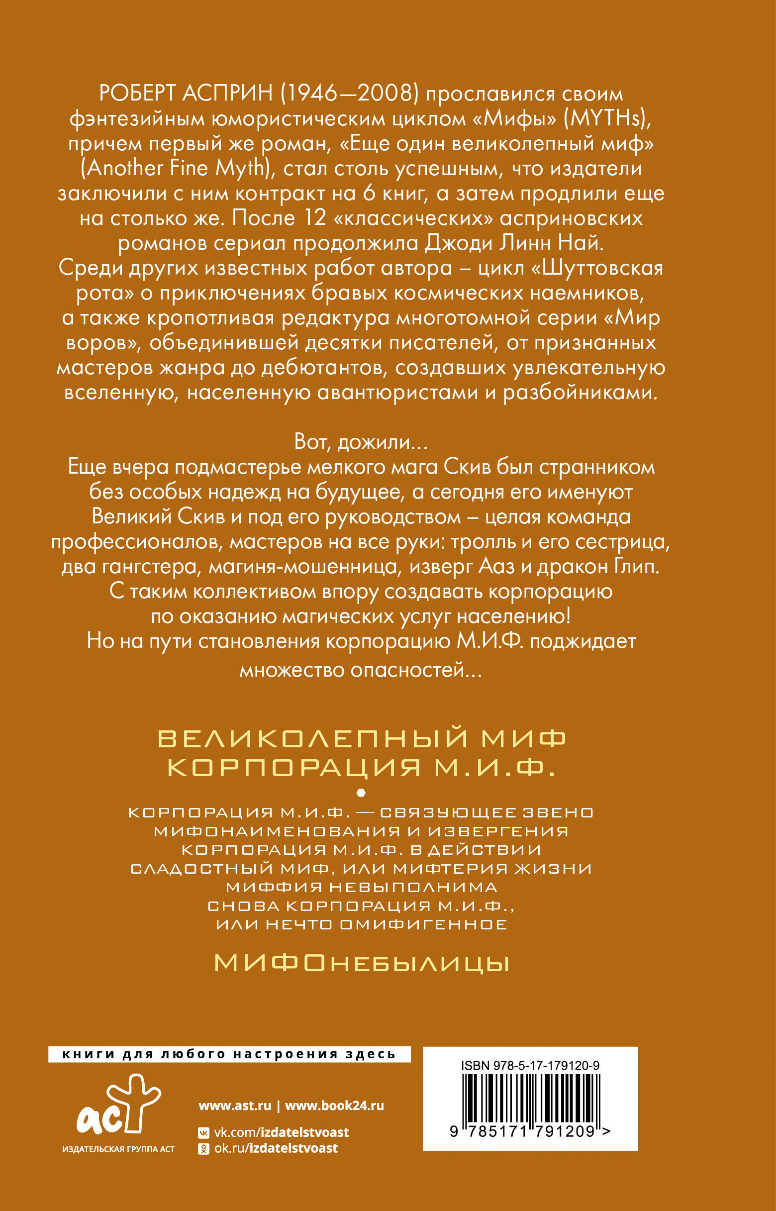 - Роберт Асприн - известный американский писатель, мастер юмористического фэнтези и фантастики, автор цикла «Шуттовская рота» и создатель многотомной межавторской серии «Мир воров». - Известность автору принес роман «Еще один великолепный миф», первая книга цикла «Мифы». Популярность книги оказалась настолько велика, что издатель тут же заключил с Асприном контракт сразу на шесть романов. - Цикл «Мифы» состоит из двенадцати романов основного цикла, а также десятка продолжений, написанных в соавторстве с Джоди Линн Най. - В данный сборник вошли вторые шесть романов цикла «Мифы». - Цикл «Мифы» считается классикой юмористического фэнтези. - Для всех поклонников Терри Пратчетта и Гарри Гаррисона.| Издательство | Издательство "АСТ" |