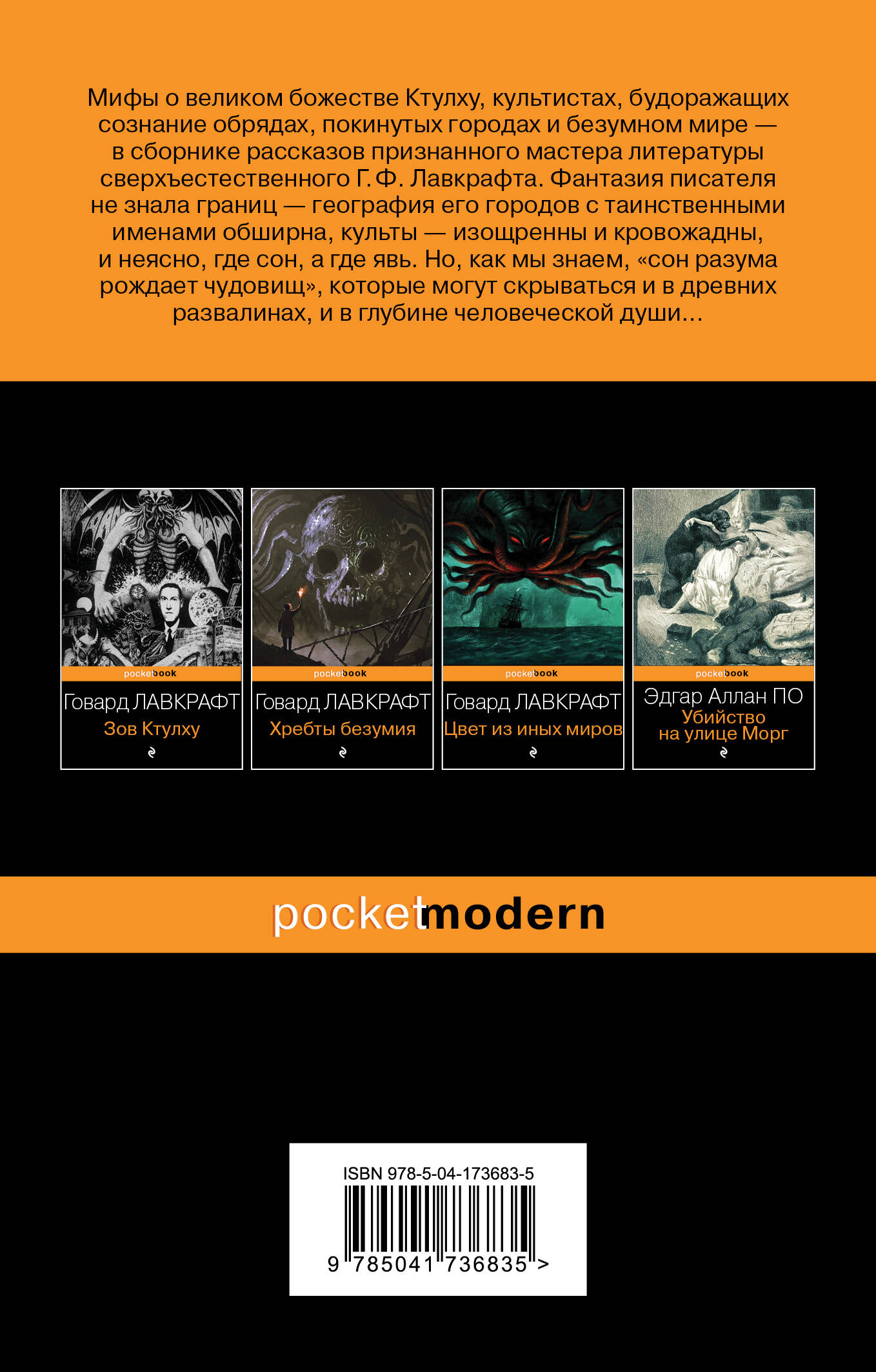 Мифы о великом божестве Ктулху, культистах, будоражащих сознание обрядах, покинутых городах и безумном мире - в сборнике рассказов признанного мастера литературы сверхъестественного Г.Ф. Лавкрафта. Фантазия писателя не знала границ - география его городов с таинственными именами обширна, культы - изощренны и кровожадны, и неясно, где сон, а где явь. Но, как мы знаем, «сон разума рождает чудовищ», которые могут скрываться и в древних развалинах, и в глубине человеческой души...| Издательство | ООО "Издательство "Эксмо" |