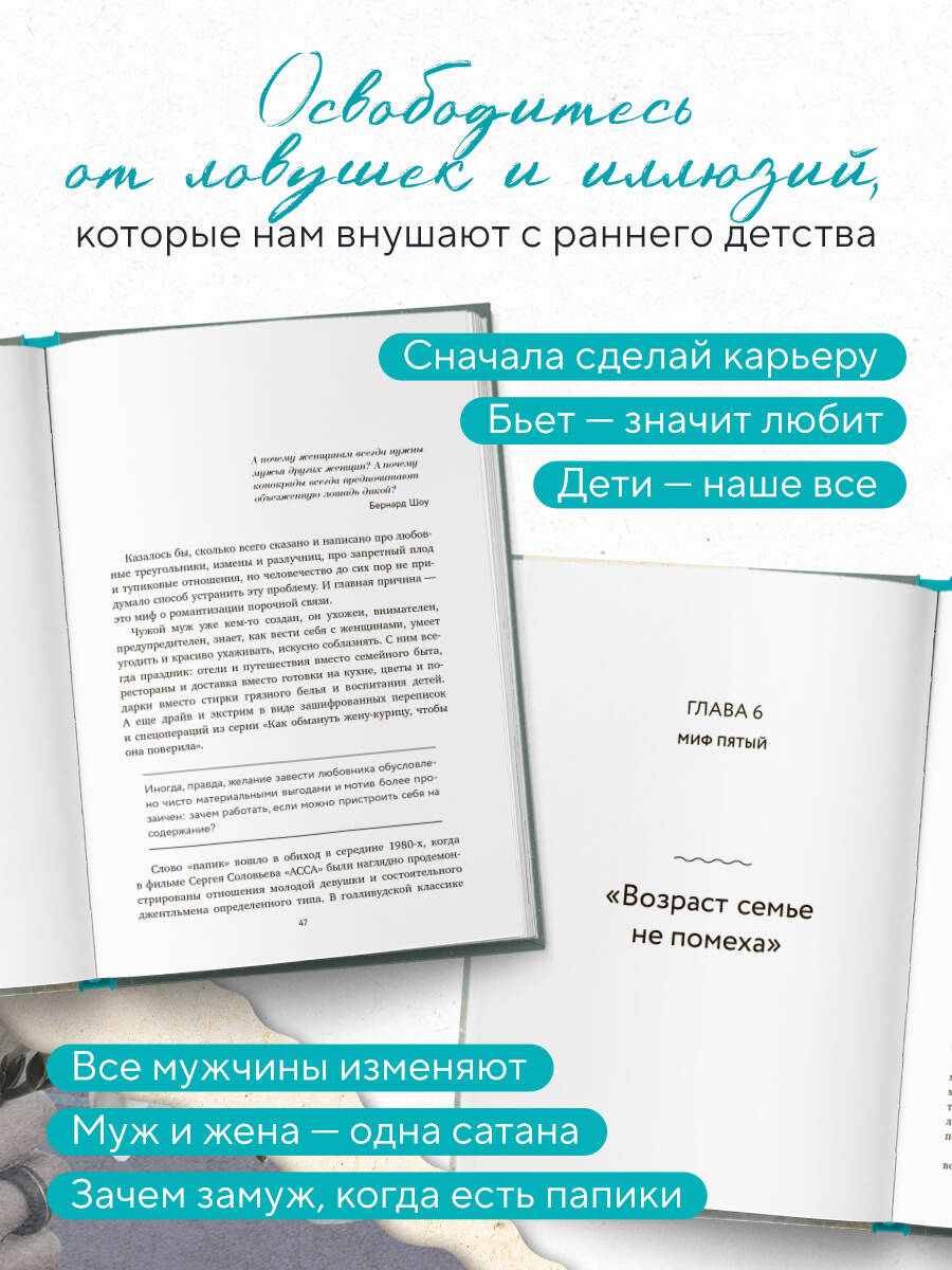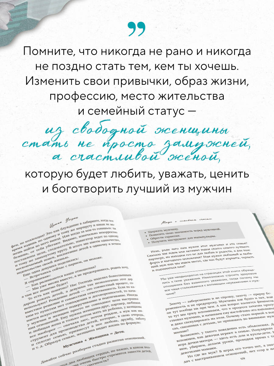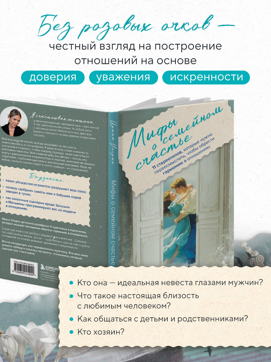 Книга, которая откроет вам глаза на то, что мешает настоящей любви, и подскажет путь к зрелым, счастливым отношениям. Вы уверены, что знаете, как построить счастливый брак? А что, если ваши представления - это всего лишь мифы, впитанные с детства из сказок, фильмов и советов самых близких людей? Автор книги Ирина Ульрих детально разобрала 11 ключевых стереотипов, которые мешают женщинам обрести гармонию в отношениях. Вы узнаете: • какие убеждения незаметно разрушают ваш союз; • почему «добрые» советы мам и бабушек порой заводят в тупик; • как сказочные сценарии вроде Золушки и Мальвины программируют вас на неудачи в отношениях. Структура книги построена в формате ДО и ПОСЛЕ. Сначала - честный разбор мифов. Затем - практичные советы, как строить отношения на основе доверия, уважения и искренности. Это не инструкция, как перевоспитать мужчину. Это ваш шанс увидеть правду и, наконец, построить отношения, которые cделают вас счастливой.| Издательство | ООО "Издательство "Эксмо" |