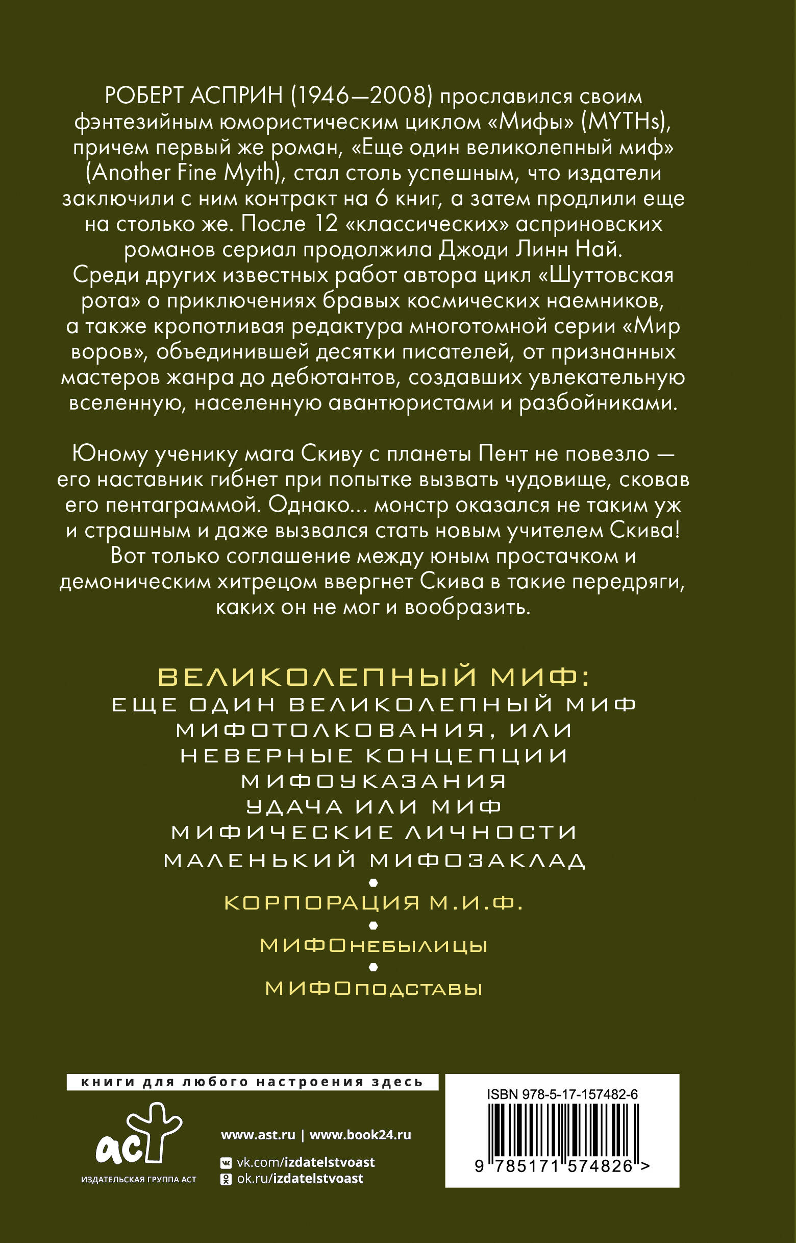 - Роберт Асприн - известный американский писатель, мастер юмористического фэнтези и фантастики, автор цикла «Шуттовская рота» и создатель многотомной межавторской серии «Мир воров». - Известность автору принес роман «Еще один великолепный миф», первая книга цикла «Мифы». Популярность книги оказалась настолько велика, что издатель тут же заключил с Асприном контракт сразу на шесть романов. - В данный сборник вошли первые шест романов цикла «Мифы». - Цикл «Мифы» считается классикой юмористического фэнтези. - Для всех поклонников Терри Пратчетта и Гарри Гаррисона.| Издательство | Издательство "АСТ" |