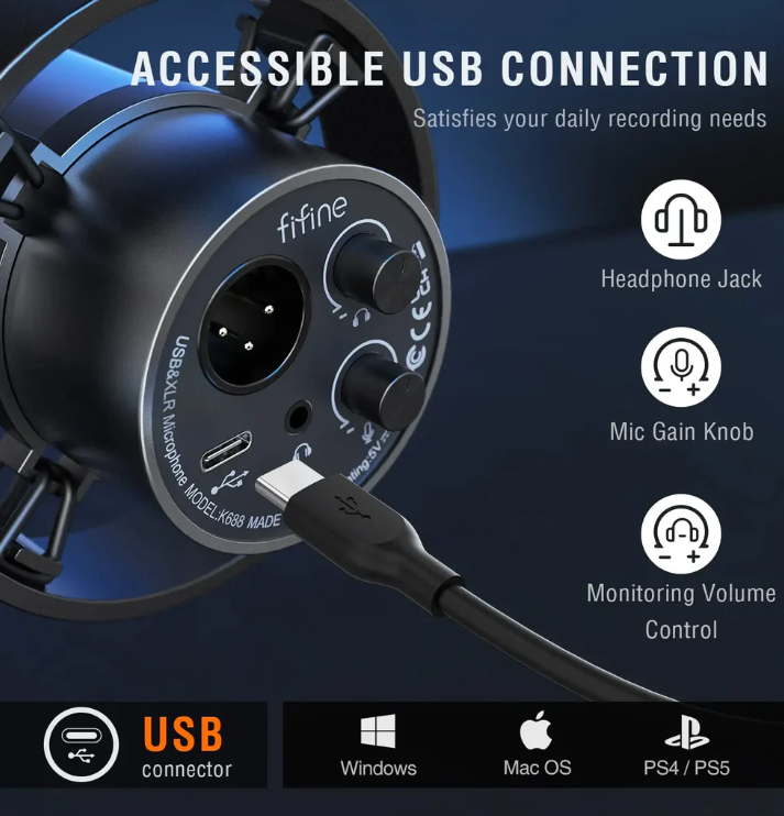 Подключение: USB тип-C (микрофонный конец) к типу-A 2.0 (компьютерный конец), XLR