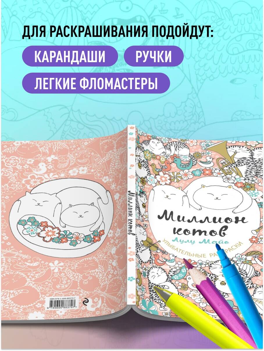 Коты, играющие на музыкальных инструментах, веселые котята, прыгающие по ветвям деревьев и крышам домов, важные коты, примеряющие шляпы, коты большие и маленькие - да их тут целый миллион! Прекрасный подарок любителям милых котиков и очаровательных раскрасок - творения Лулу Майо никого не оставят равнодушным!| Издательство | ООО "Издательство "Эксмо" |