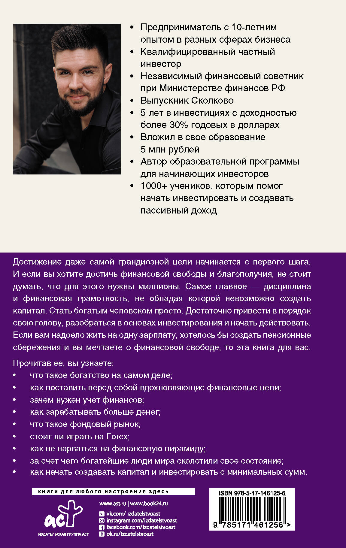 • Предприниматель с 10-летним опытом в разных сферах бизнеса • Квалифицированный частный инвестор • Независимый финансовый советник при Министерстве финансов РФ • Выпускник Сколково • 5 лет в инвестициях с доходностью более 30% годовых в долларах • Вложил в свое образование 5 млн рублей • Автор образовательной программы для начинающих инвесторов • 1000+ учеников, которым помог начать инвестировать и создавать пассивный доход Если вам надоело жить на одну зарплату, хотелось бы создать пенсионные сбережения и вы мечтаете о финансовой свободе, то эта книга для вас. Прочитав ее, вы узнаете: • что такое богатство на самом деле; • как поставить перед собой вдохновляющие финансовые цели; • зачем нужен учет финансов; • как зарабатывать больше денег; • что такое фондовый рынок; • стоит ли играть на Forex; • как не нарваться на финансовую пирамиду; • за счет чего богатейшие люди мира сколотили свое состояние; • как начать создавать капитал и инвестировать с минимальных сумм.| Издательство | Издательство "АСТ" |