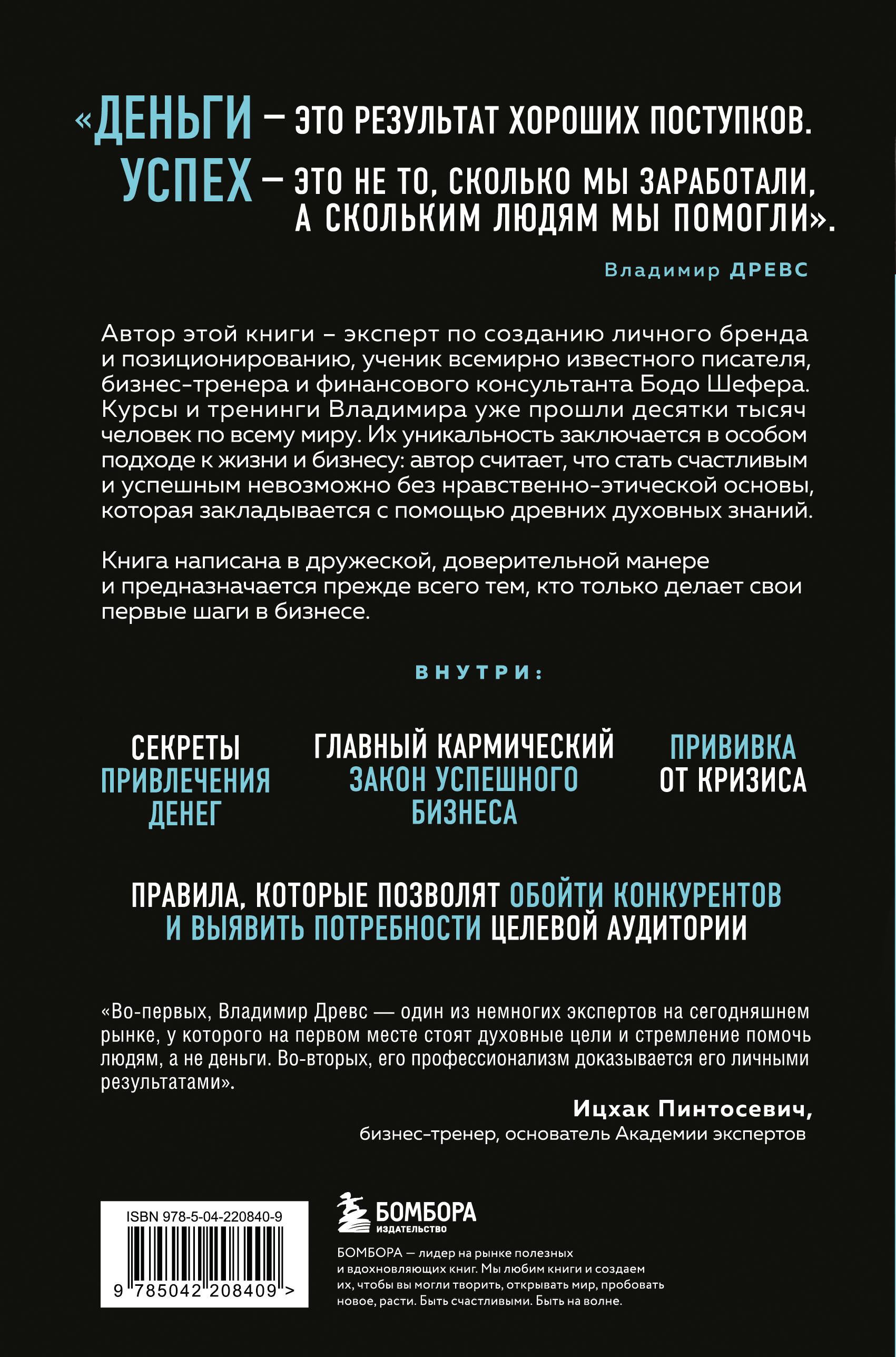 Секреты привлечения денег, главный кармический закон успешного бизнеса, прививка от кризиса, правила, которые позволят обойти конкурентов и выявить потребности целевой аудитории, - эта книга полна практических советов для тех, кто начинает свой путь в бизнесе. Ученик бизнес-тренера и финансового консультанта Бодо Шефера - Владимир Древс - рассказывает, как построить свой личный бренд и создать правильное позиционирование своего продукта. Как сделать этот мир добрее, а себя - успешнее. Книга написана в особой доверительной манере и предназначена тем, кто делает свои первые шаги в бизнесе. «Деньги - это результат хороших поступков. Успех - это не то, сколько мы заработали, а скольким людям мы помогли», - считает автор. «Во-первых, Владимир Древс - один из немногих экспертов на сегодняшнем рынке, у которого на первом месте стоят духовные цели и стремление помочь людям, а не деньги. Во-вторых, его профессионализм доказывается его личными результатами». - Ицхак Пинтосевич, бизнес-тренер, основатель Академии экспертов «Владимир Древс в своей компактной и легко читаемой книге дает систему простых ответов на сложный вопрос: как создать и усилить свой личный бренд? Маленькими шагами вы можете двигаться к большой цели, заручившись поддержкой автора. Открывайте скорее первую страницу, и вперед! Ведь вы достойны большего!» - Радислав Гандапас, бизнес-тренер, президент Ассоциации спикеров России «Уверен, что данная книга поможет вам раскрыть и понять свое настоящее предназначение, даст возможность не только зарабатывать деньги и быть известным, но и поистине приносить пользу людям на основе именно вашего предназначения, меняя мир к лучшему. Это книга, которая поможет улучшить вашу жизнь, жизнь окружающих вас людей и всего мира. Я желаю вам счастья и успеха, дорогой читатель!» - Олег Торсунов, кандидат медицинских наук, специалист по общественному здоровью, известный во всем мире писатель и лектор «Трогает глубокая убежденность Владимира в том, что книга попадет в руки "правильных" людей, которые, как и он сам, направят полученные знания только во благо человечеству и планете. Что известность и влияние придут к нам после прочтения этой книги». - Деда Алекс, семейный конфликтолог| Издательство | ООО "Издательство "Эксмо" |