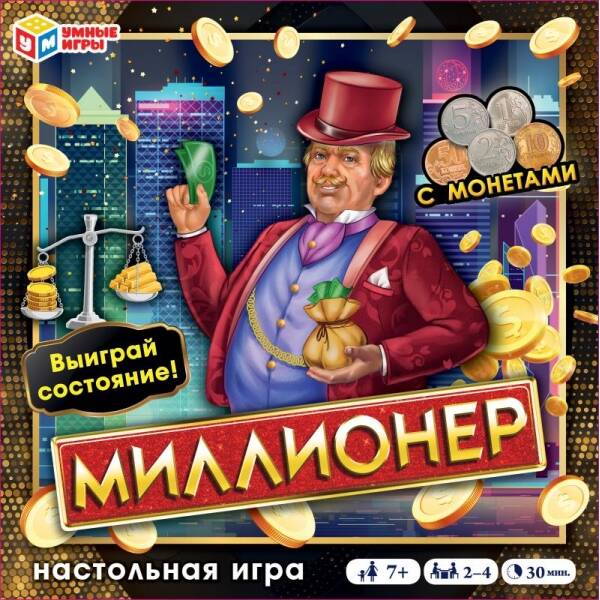 Аннотация: Миллионер с монетами. Настольная игра. 250х250х55 мм. Умные игры. в кор.10шт