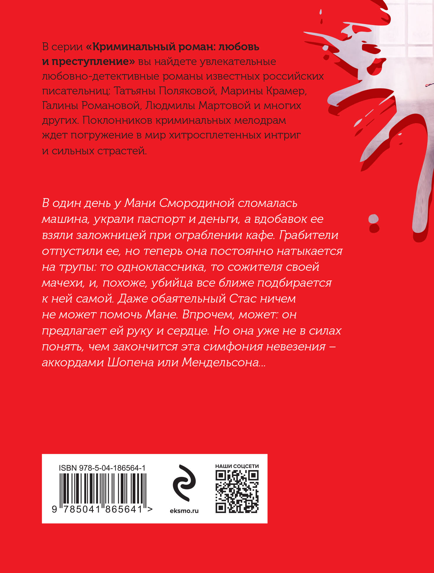 В один день у Мани Смородиной сломалась машина, украли паспорт и деньги, а вдобавок ее взяли заложницей при ограблении кафе. Грабители отпустили ее, но теперь она постоянно натыкается на трупы: то одноклассника, то сожителя своей мачехи, и, похоже, убийца все ближе подбирается к ней самой. Даже обаятельный Стас ничем не может помочь Мане. Впрочем, может: он предлагает ей руку и сердце. Но она уже не в силах понять, чем закончится эта симфония невезения - аккордами Шопена или Мендельсона...| Издательство | ООО "Издательство "Эксмо" |
