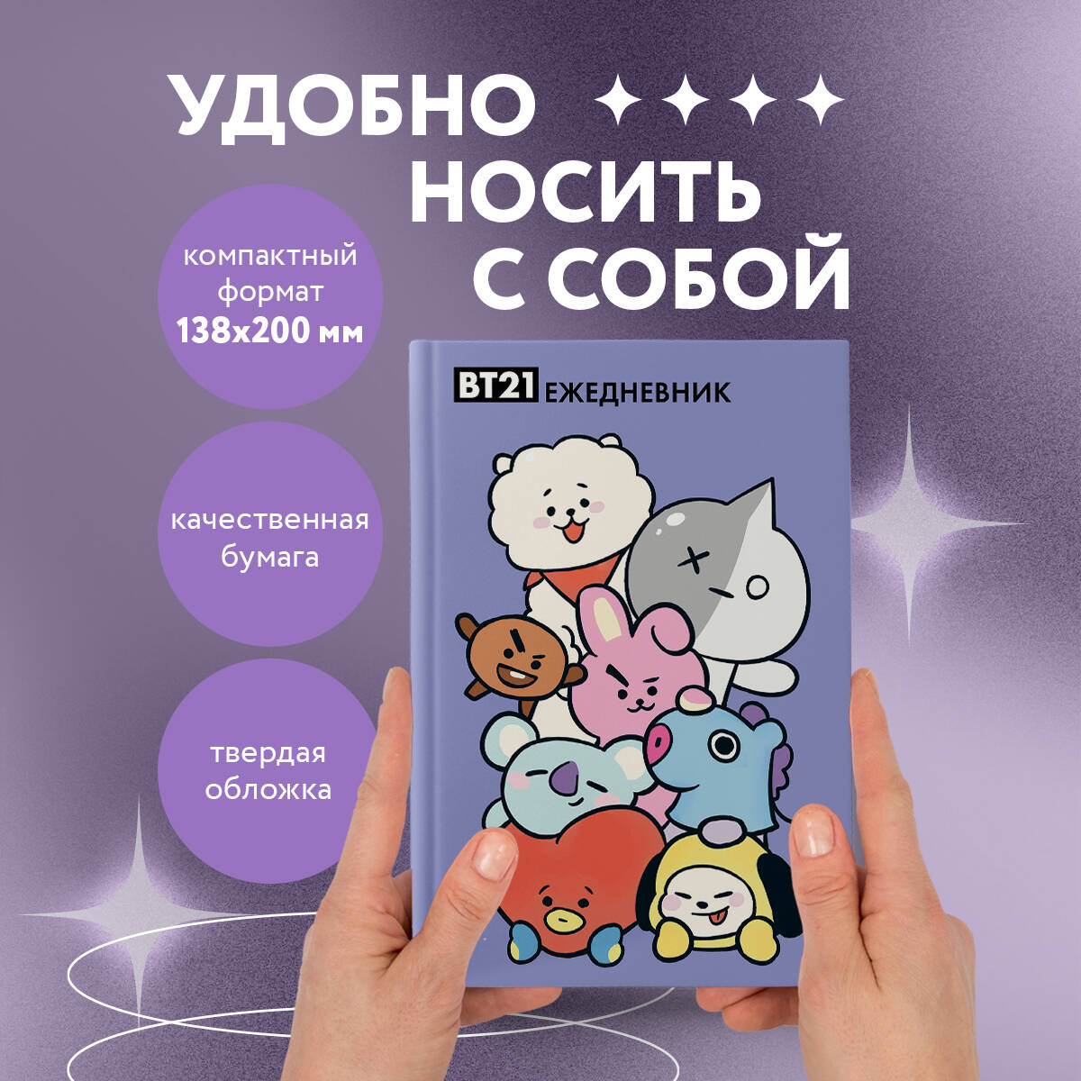 Яркий и крутой ежедневник с милыми BT21! Ежедневник, который поможет справиться с любой задачей, распланировать все дела и поднимет настроение своей стильной обложкой. На красочных разворотах на неделю удобно записывать планы, задачи на каждый день, отслеживать привычки. Каждый разворот украшают строчки из песен группы и вдохновляющие фразы от ее участников! Отличный подарок фанату! Для кого это: - для тех, кто обожает K-POP и BTS, - для тех, кто хочет нескучно вести свои дела, - для любителей стиля в мелочах. Технические параметры: Формат: А5 (138×200 мм) Обложка: твердая Вид скрепления: шитье нитками Блок: офсет 80 гр. 72 л.